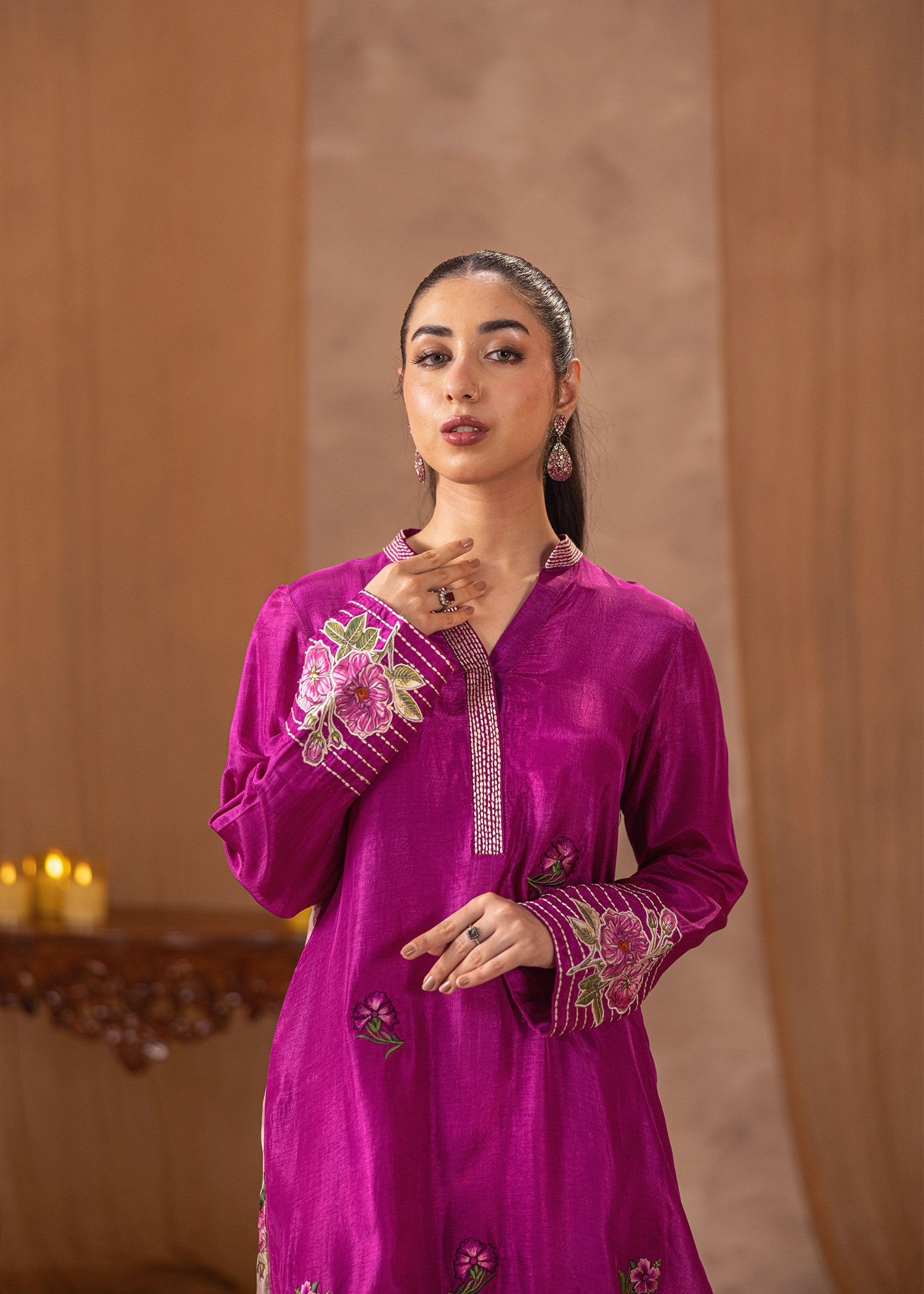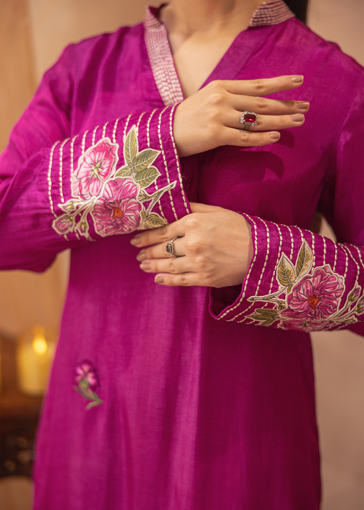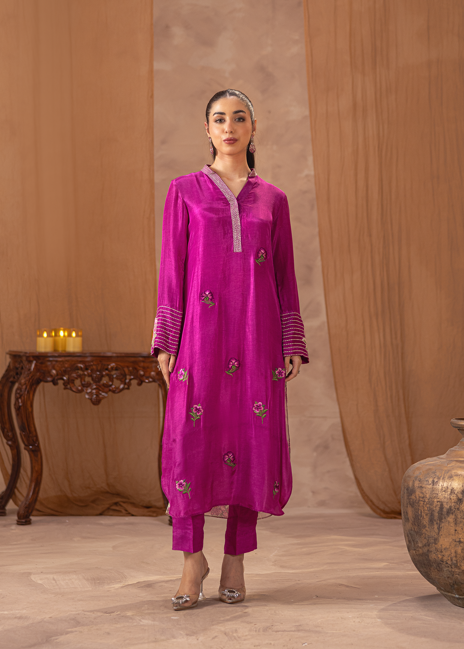 A two-piece in radiant fuchsia pink, crafted from tassel silk and pure silk. Adorned with delicate machine embroidery, the ensemble strikes a perfect balance between understated elegance and contemporary vibrance, making it ideal for refined festive dressing.