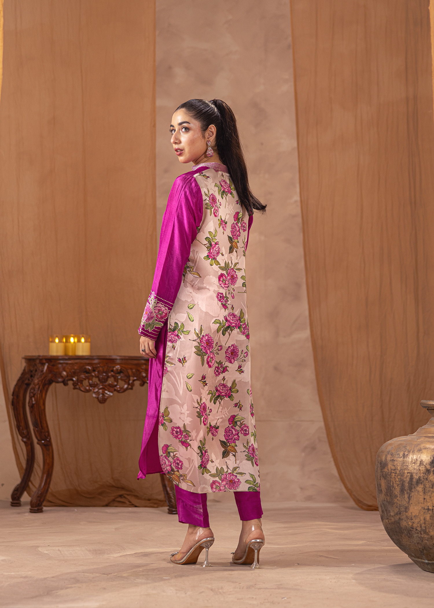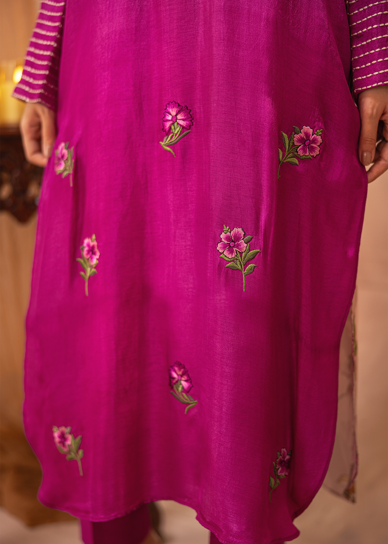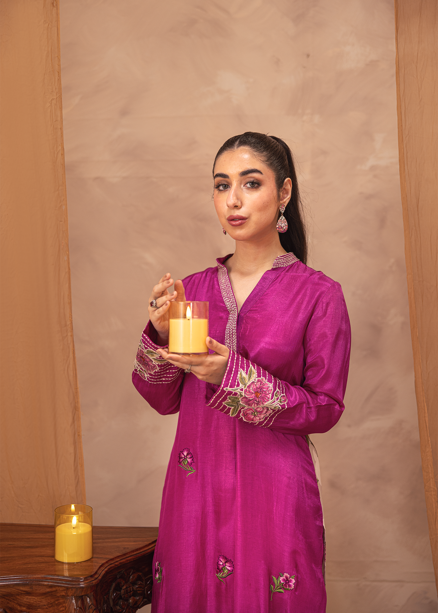 A two-piece in radiant fuchsia pink, crafted from tassel silk and pure silk. Adorned with delicate machine embroidery, the ensemble strikes a perfect balance between understated elegance and contemporary vibrance, making it ideal for refined festive dressing.