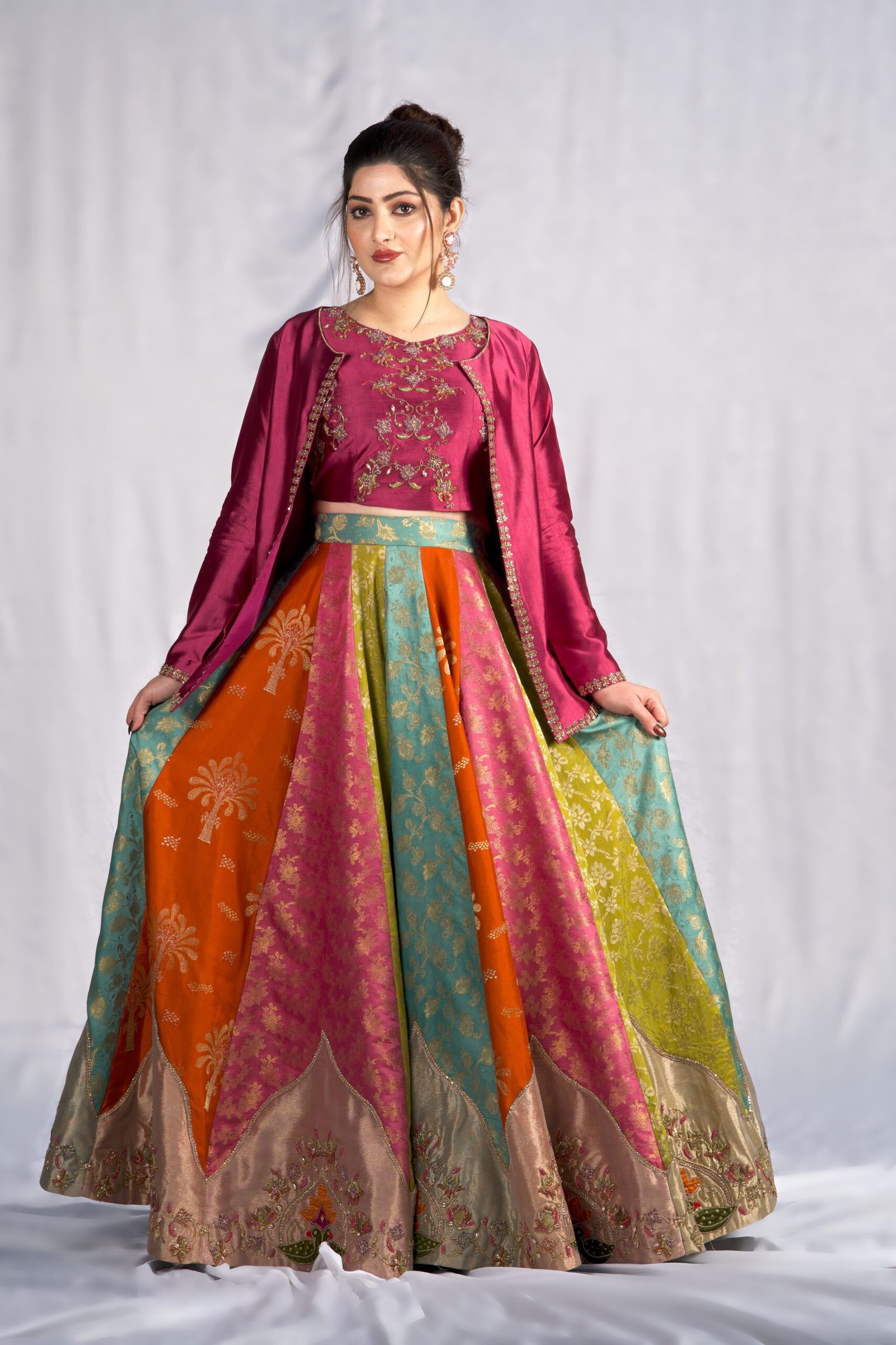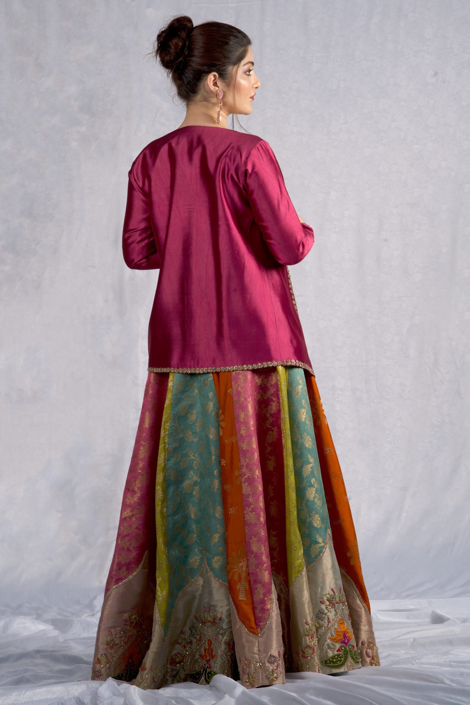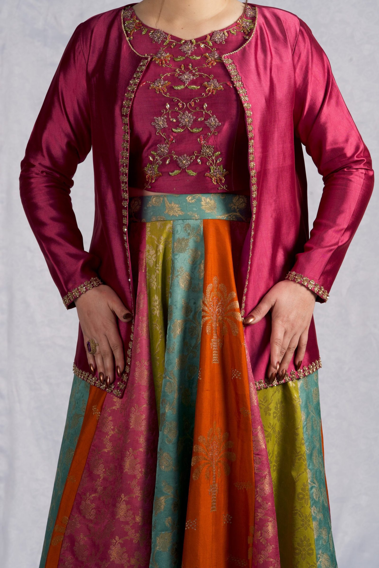 This four-piece ensemble blends sheesha silk and banaras, creating a rich, multi-textured look in shades of purple, rust, sea green, and parrot green. The jacket and bodice feature detailed applique work paired with delicate hand embellishment using dabka, stones, crystals, sequins, and katdana, giving the design a polished, festive finish.