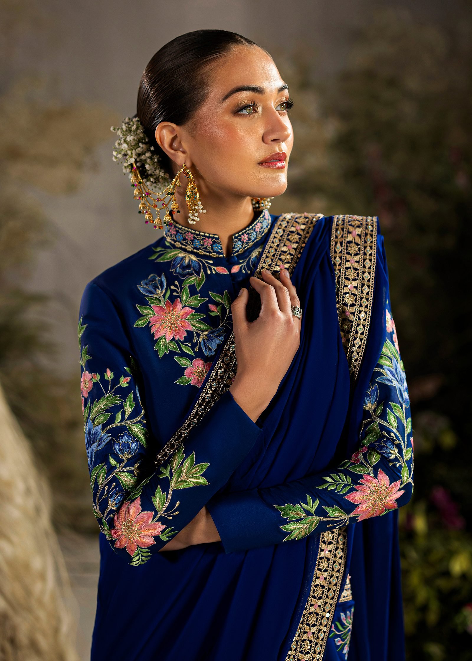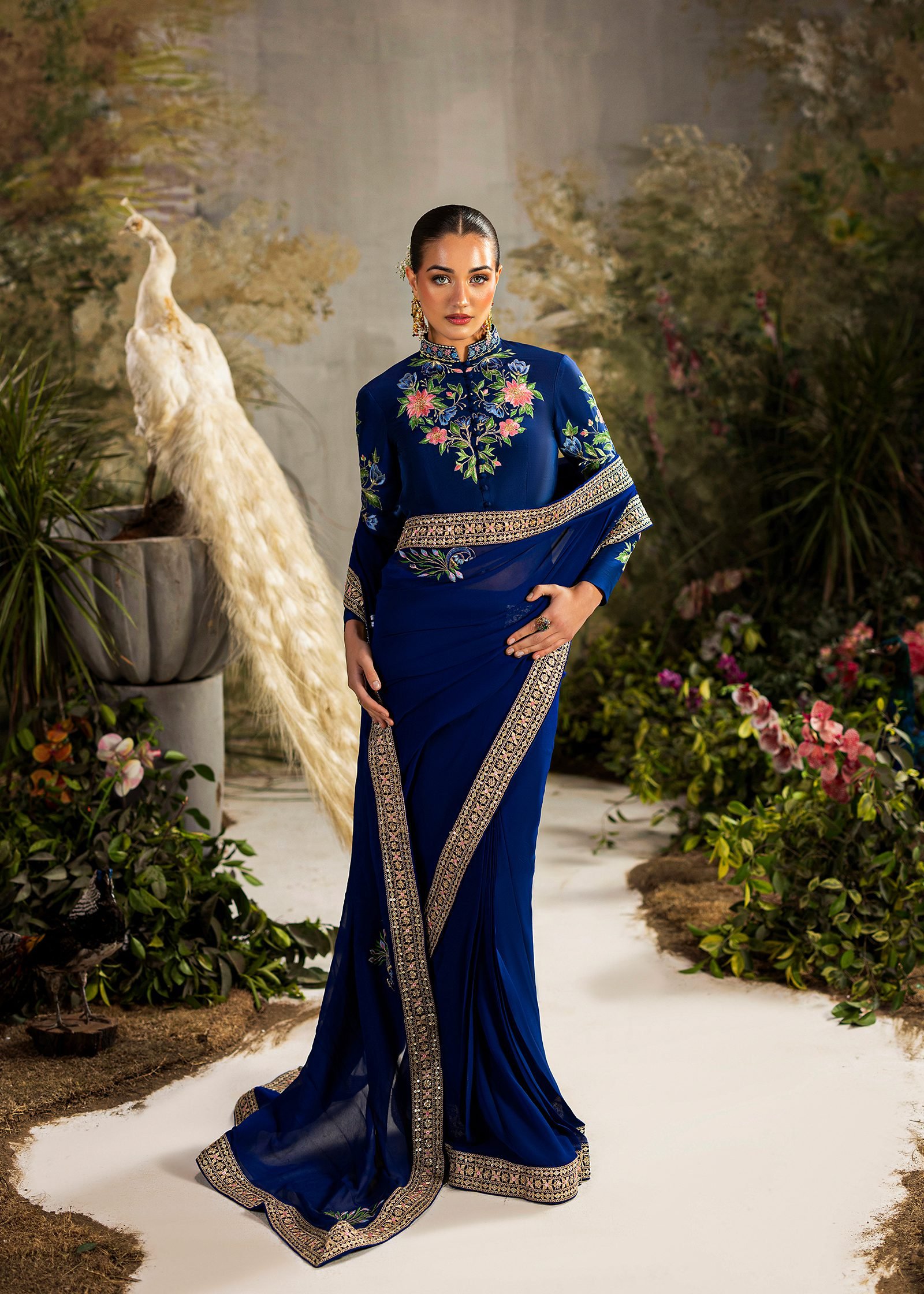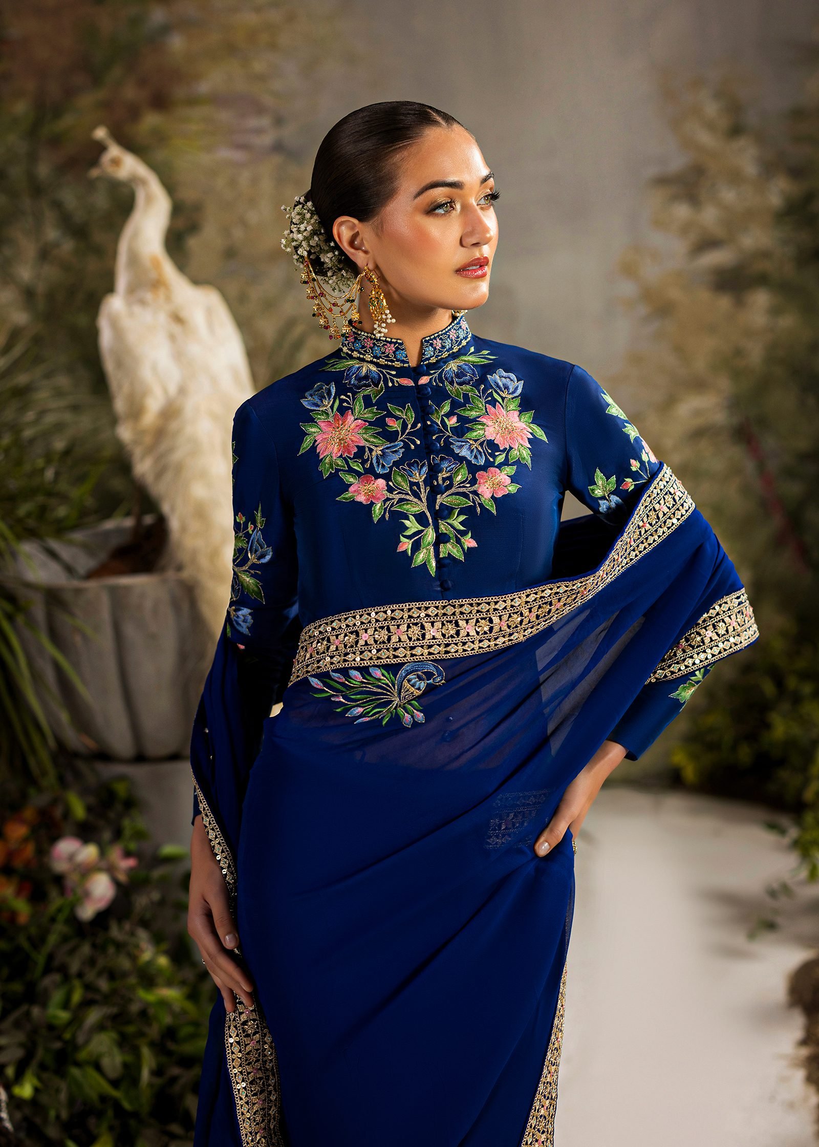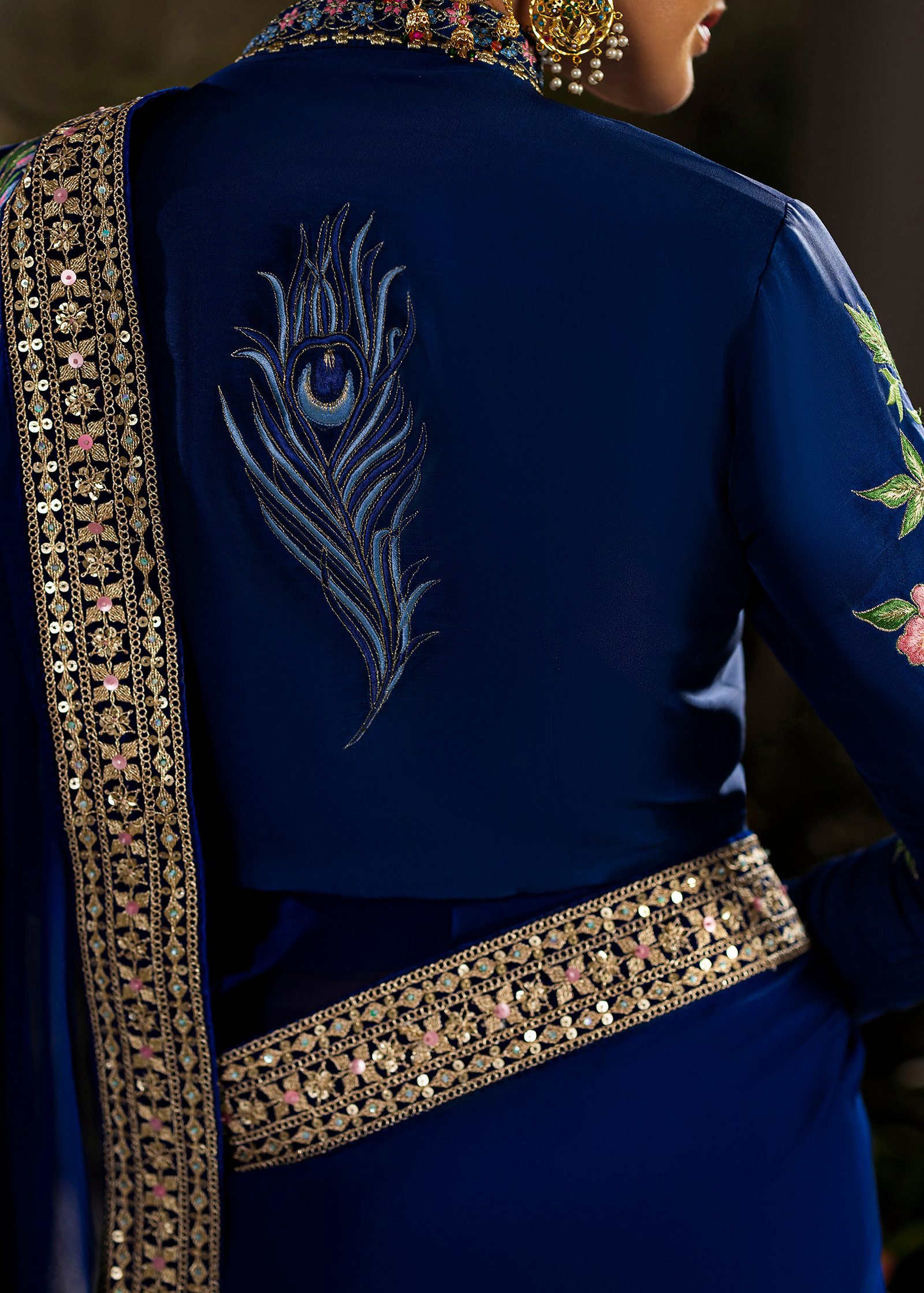 A regal royal blue ensemble crafted in shesha silk with a flowing chiffon drape. Intricate machine embroidery is enhanced with hand embellishment using cutdana and sequins. A timeless design that blends rich color, fine detail, and graceful movement.
