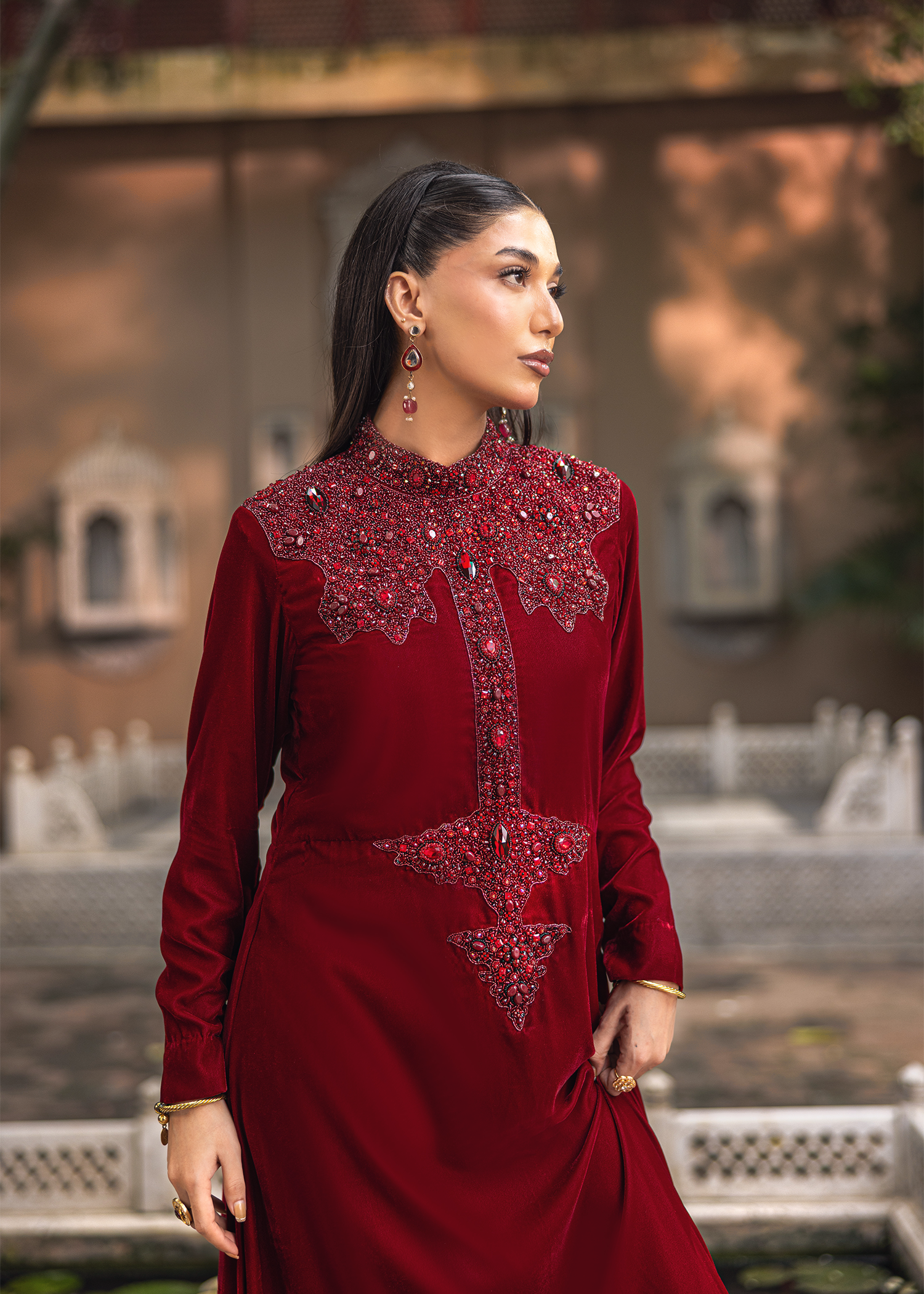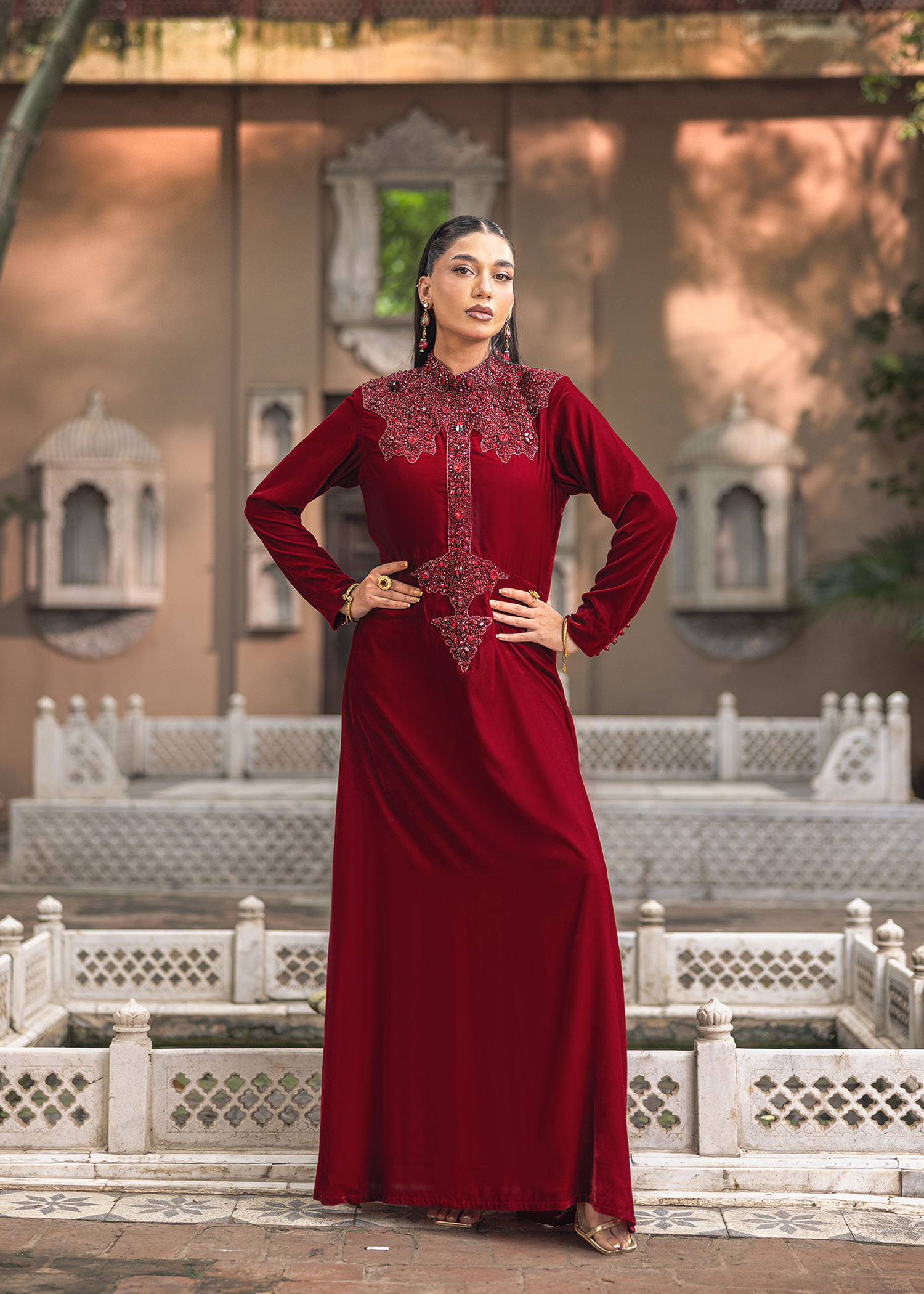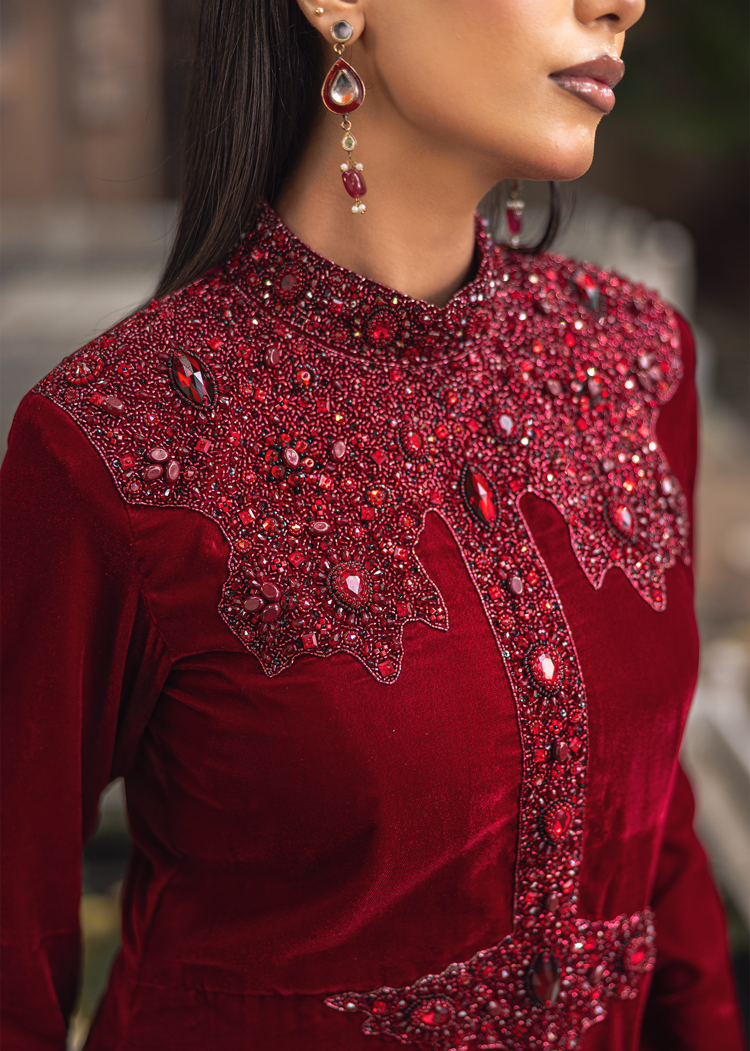 A rich maroon velvet gown, designed as a one-piece silhouette. Embellished with hand-applied stones, the piece radiates depth and sophistication, perfect for evening elegance.