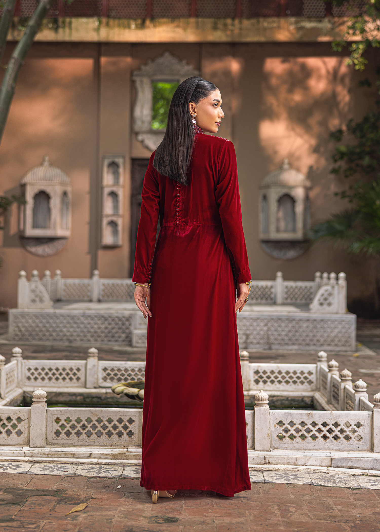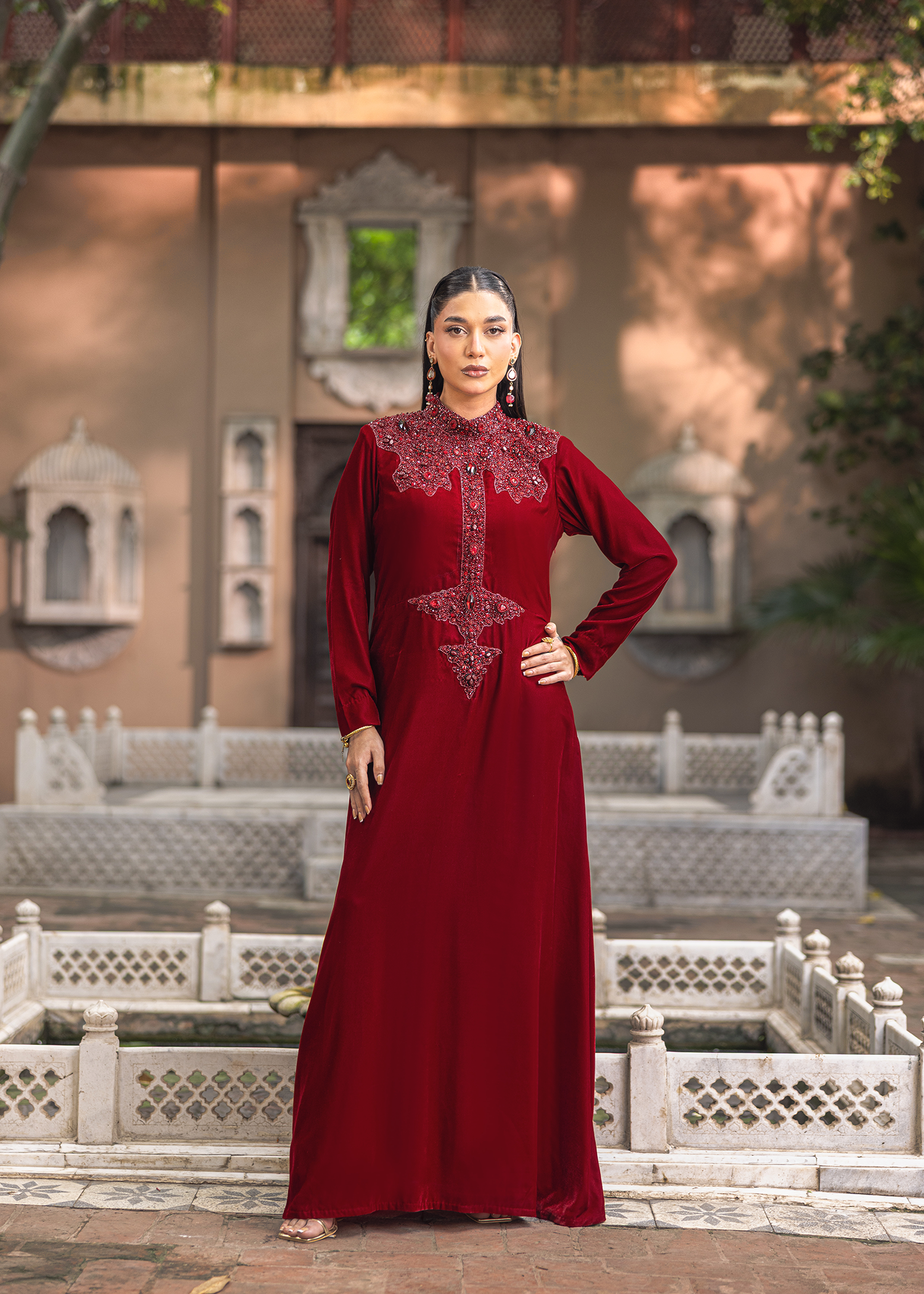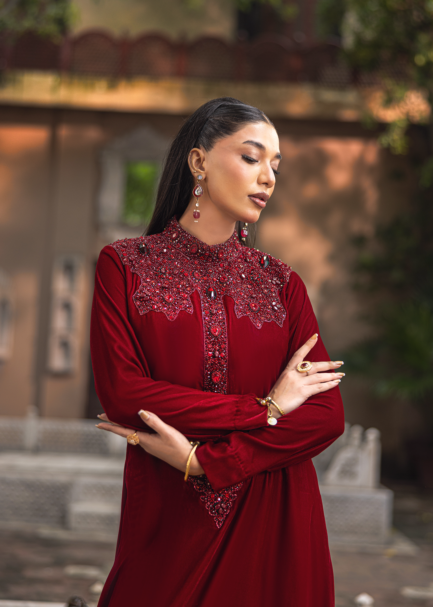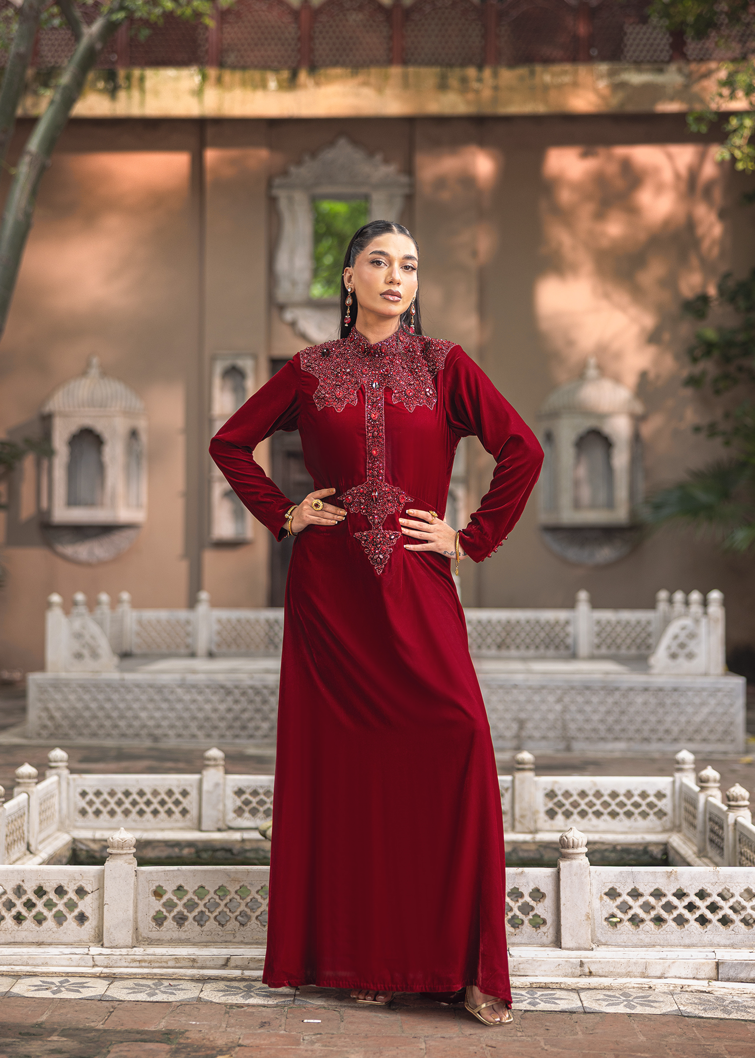 A rich maroon velvet gown, designed as a one-piece silhouette. Embellished with hand-applied stones, the piece radiates depth and sophistication, perfect for evening elegance.