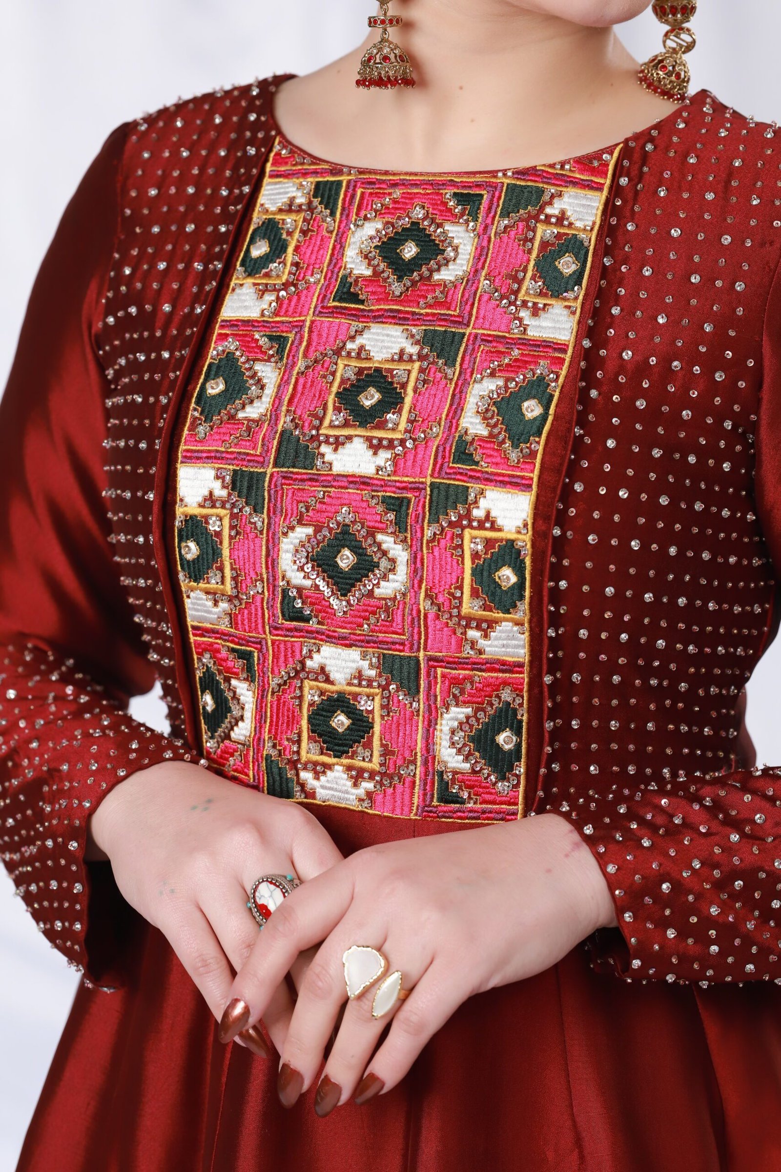 This one-piece mehroon gown is crafted from lustrous sheesha silk, giving it a rich, formal fall. The front panel and hem feature detailed machine embroidery, further elevated with hand embellishment using sequins and stones for a subtle yet striking shimmer. The dotted embellishment across the bodice and sleeves adds texture while keeping the silhouette clean and elegant.