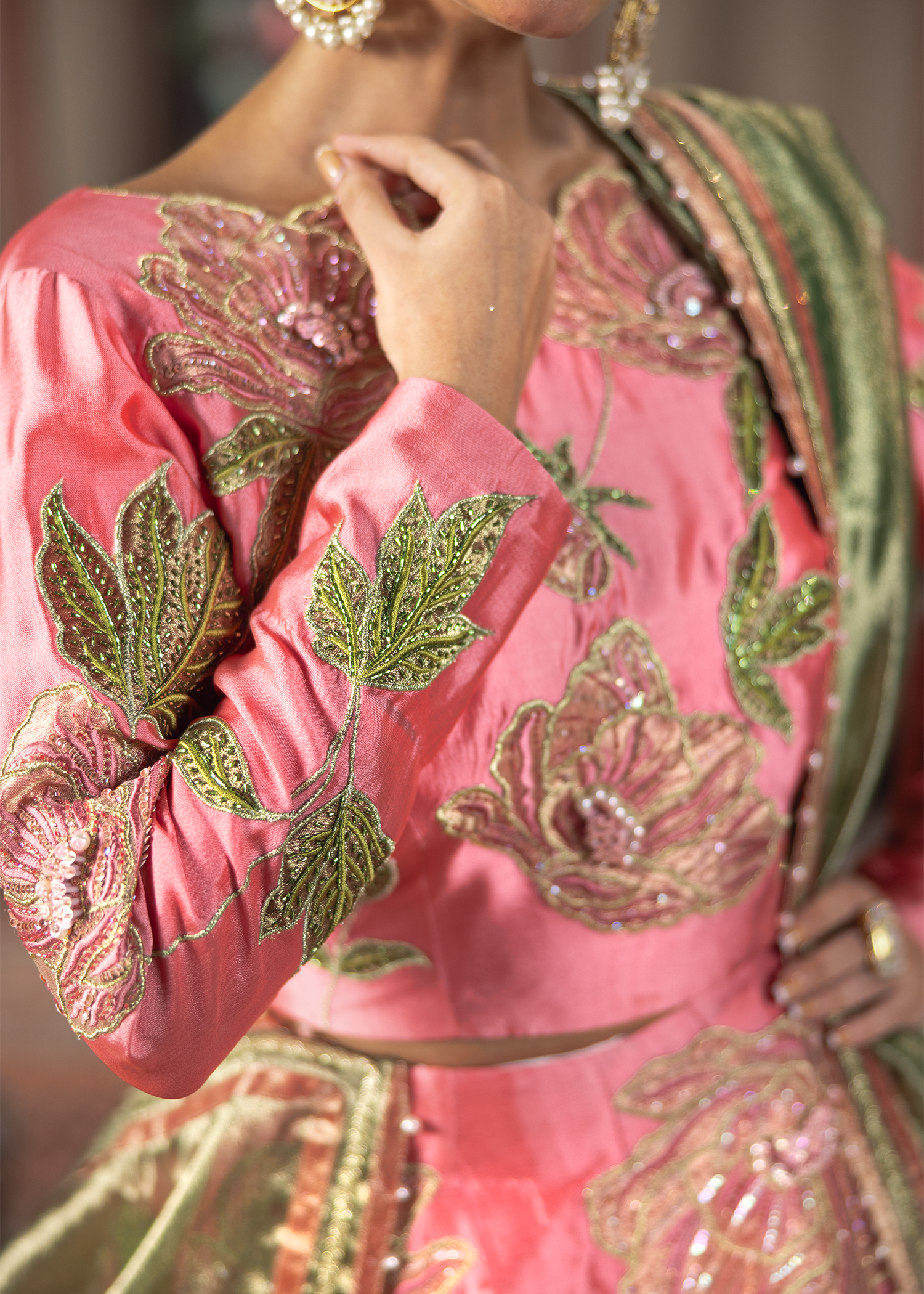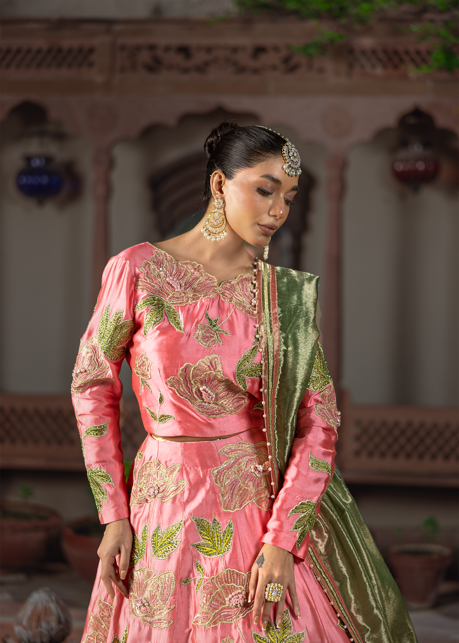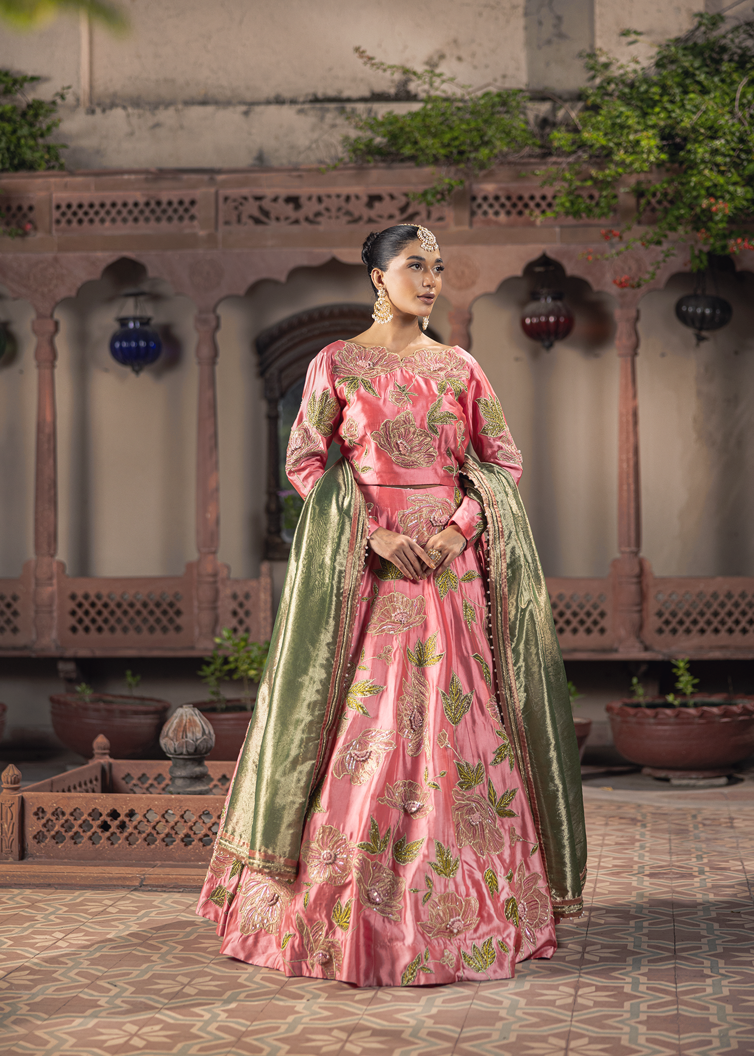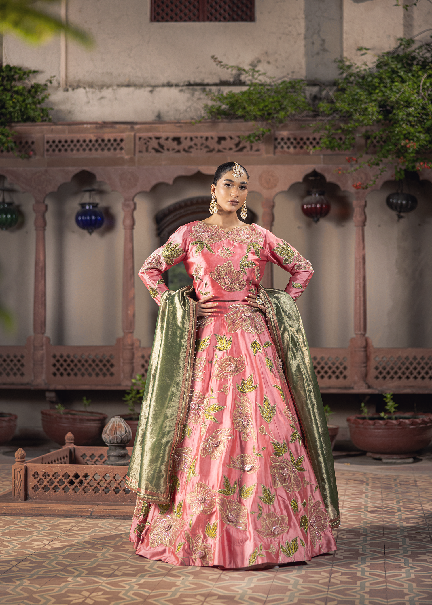 A three-piece set in punch pink and turtle green, crafted from sheesha silk and zari tissue. The lehenga and blouse are adorned with applique floral motifs, enriched with 3D embellishments of pearls, katdana, and sequins. Paired with a contrasting dupatta, the design reflects refined craftsmanship with a contemporary luxury appeal.