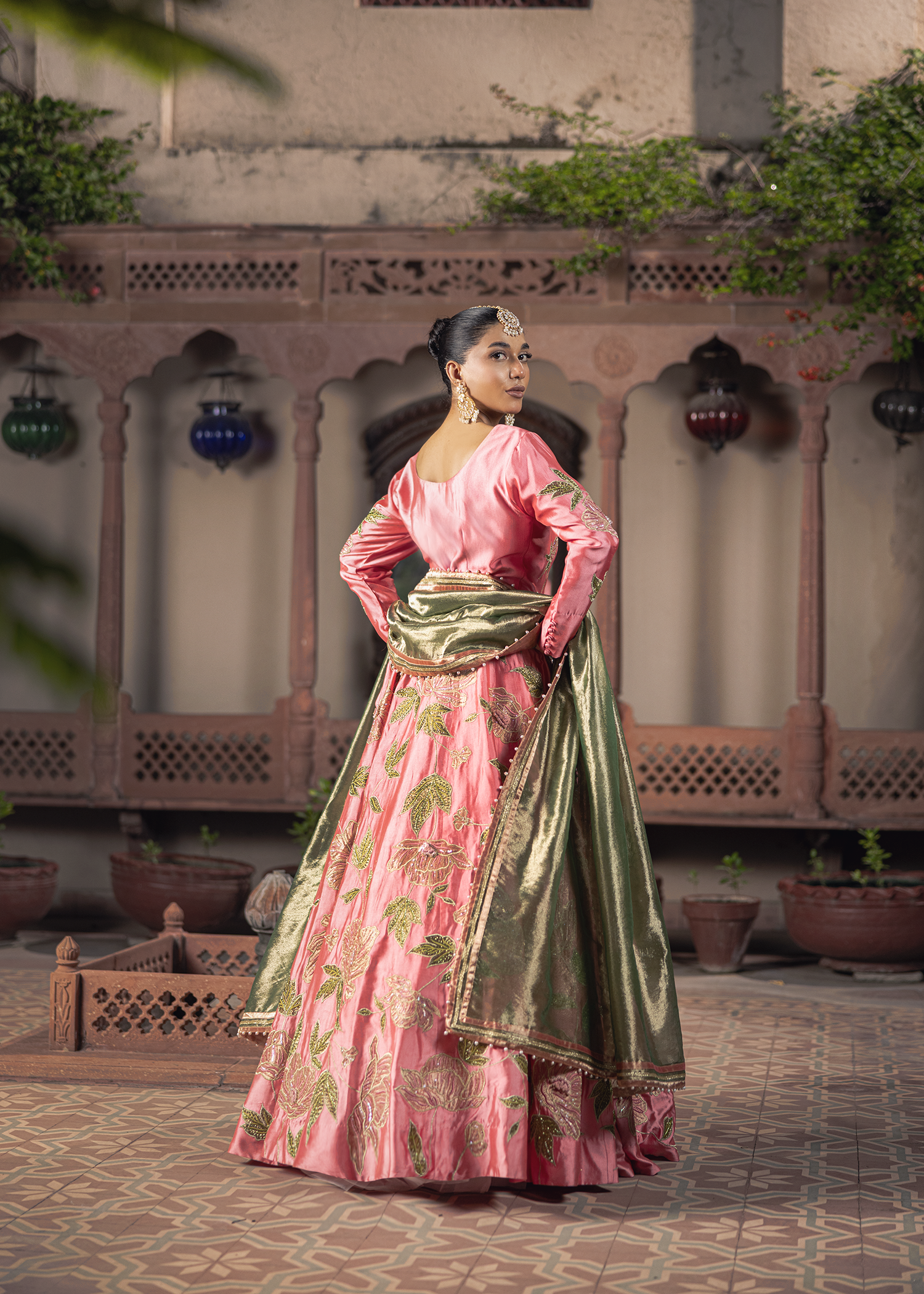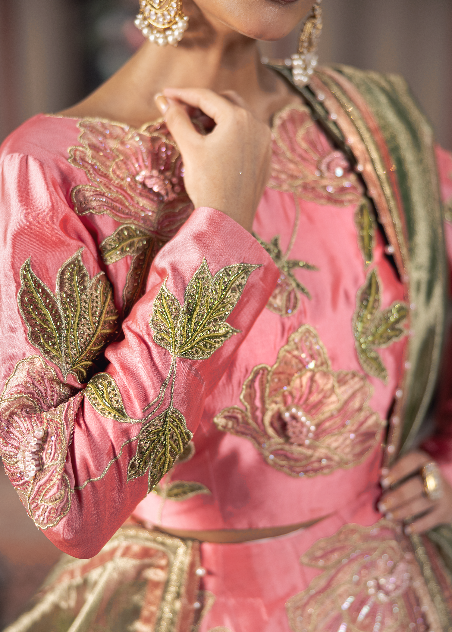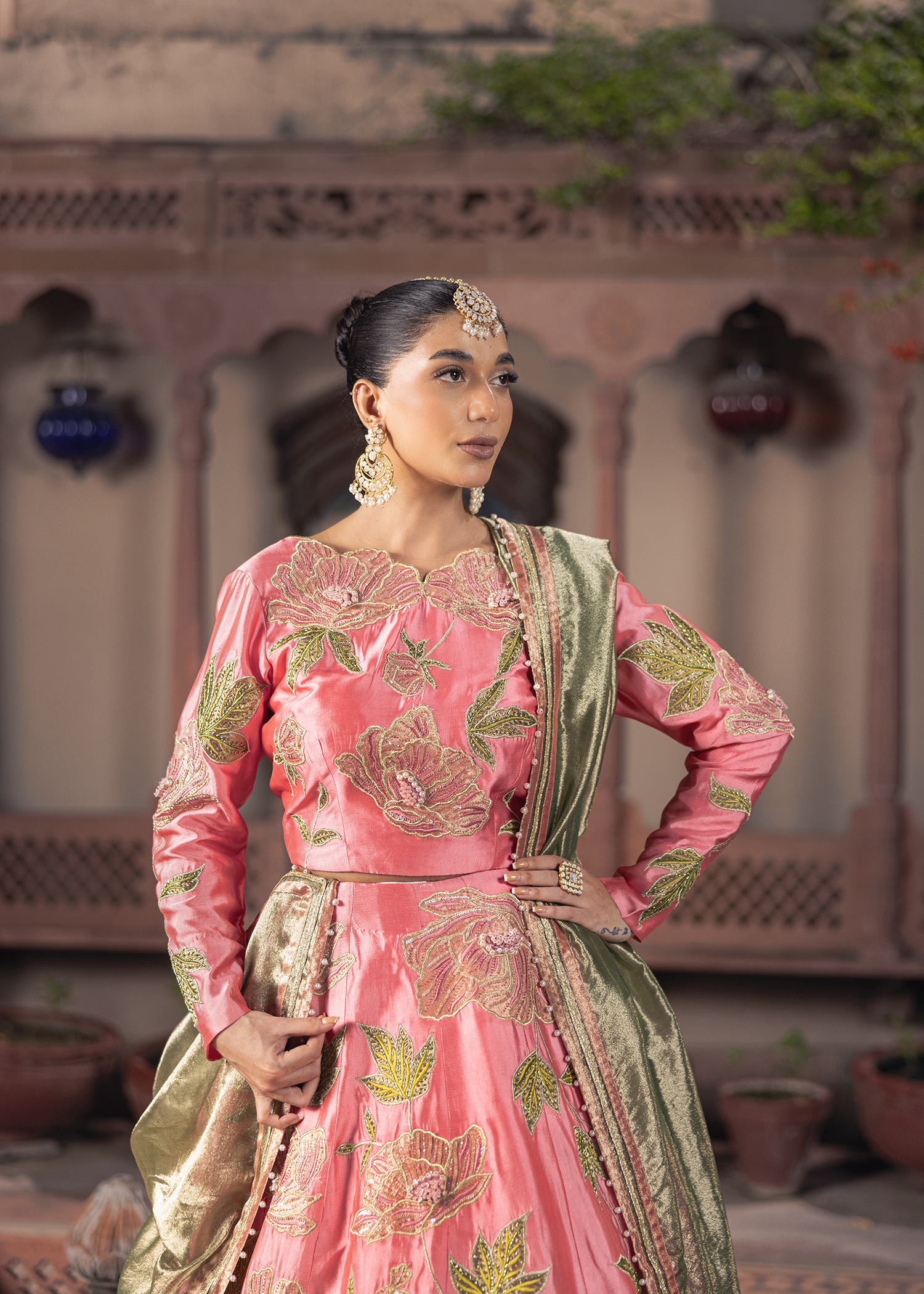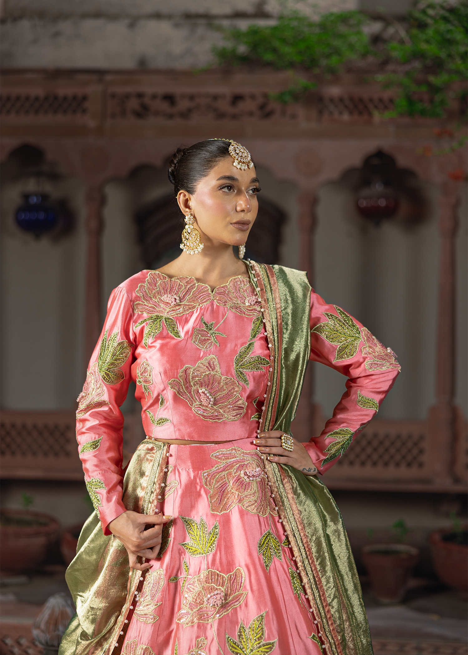 A three-piece set in punch pink and turtle green, crafted from sheesha silk and zari tissue. The lehenga and blouse are adorned with applique floral motifs, enriched with 3D embellishments of pearls, katdana, and sequins. Paired with a contrasting dupatta, the design reflects refined craftsmanship with a contemporary luxury appeal.