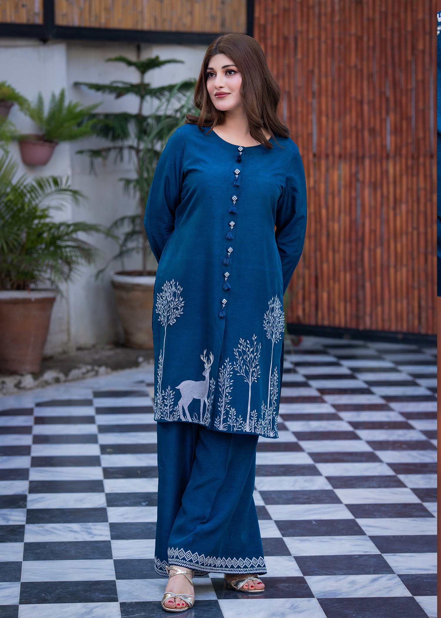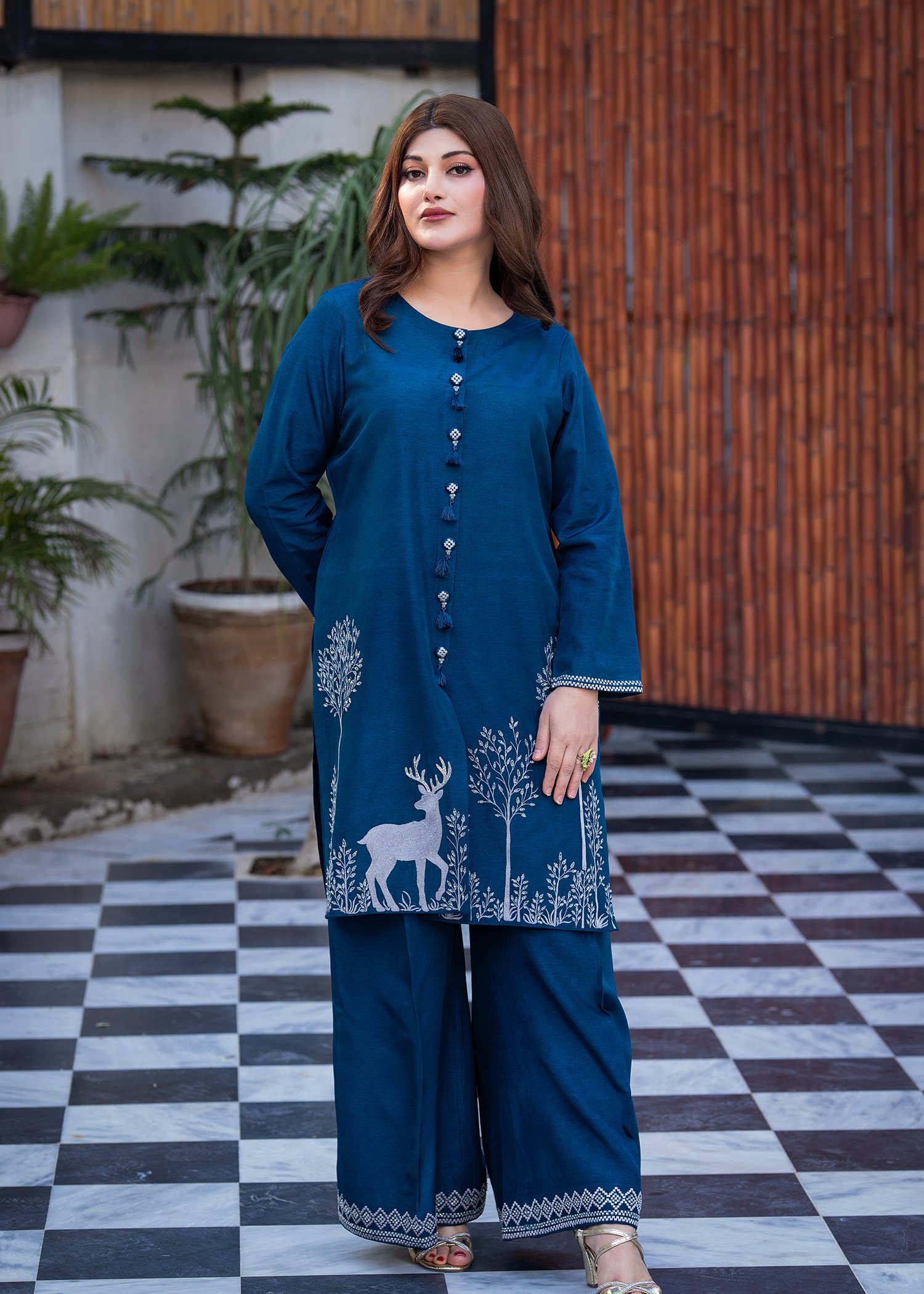Rendered in a rich Blue tone, this ensemble is crafted from smooth Tassels silk for a structured yet fluid drape. Precision machine embroidery shapes the motifs across the hem and sleeves, while hand embellishment with cutdana and stones adds subtle dimension and controlled shine.