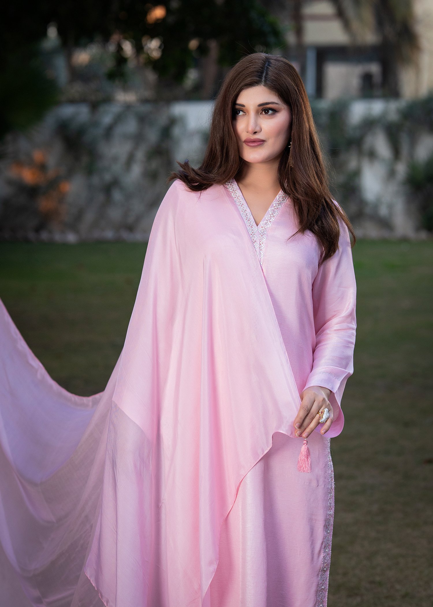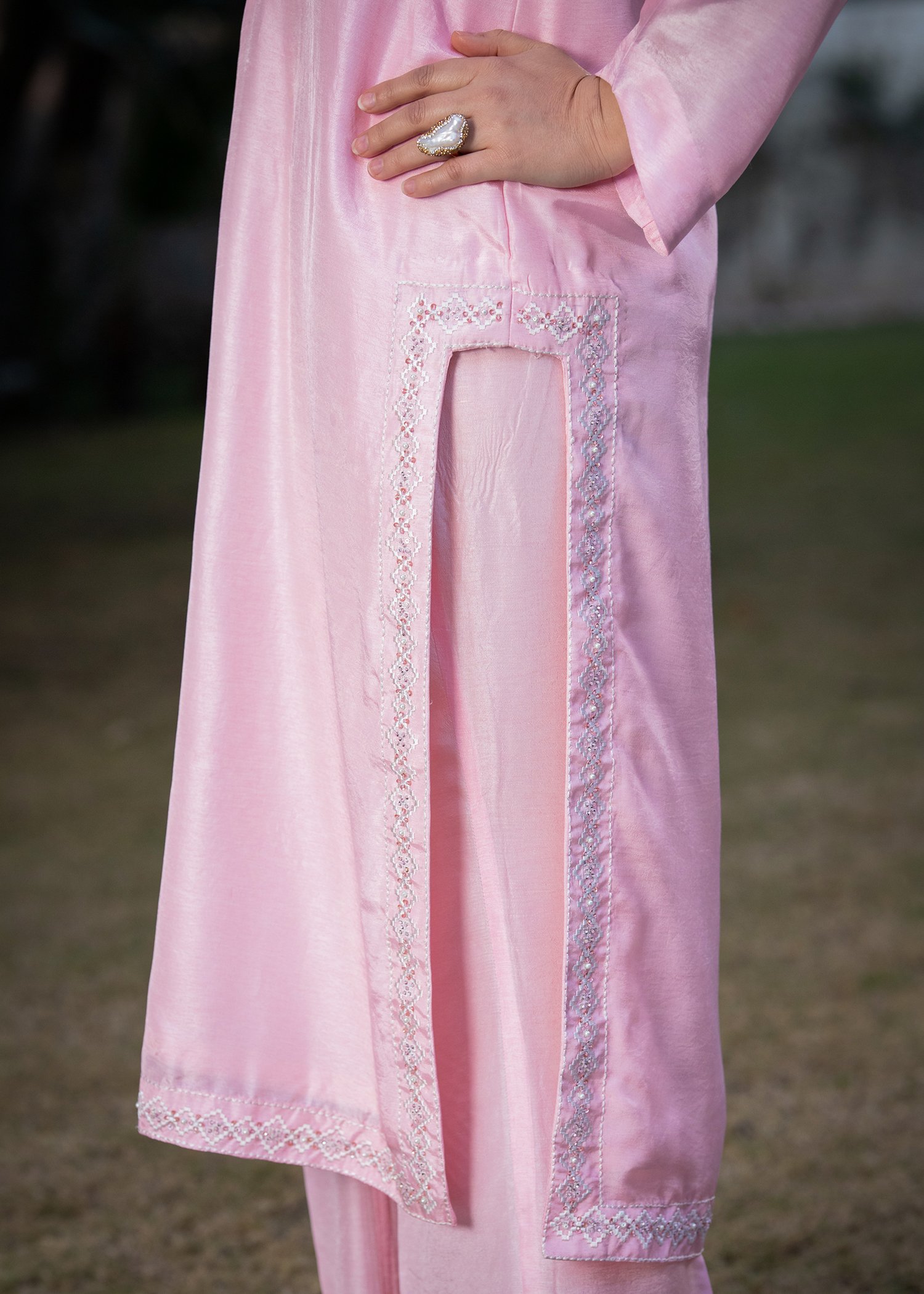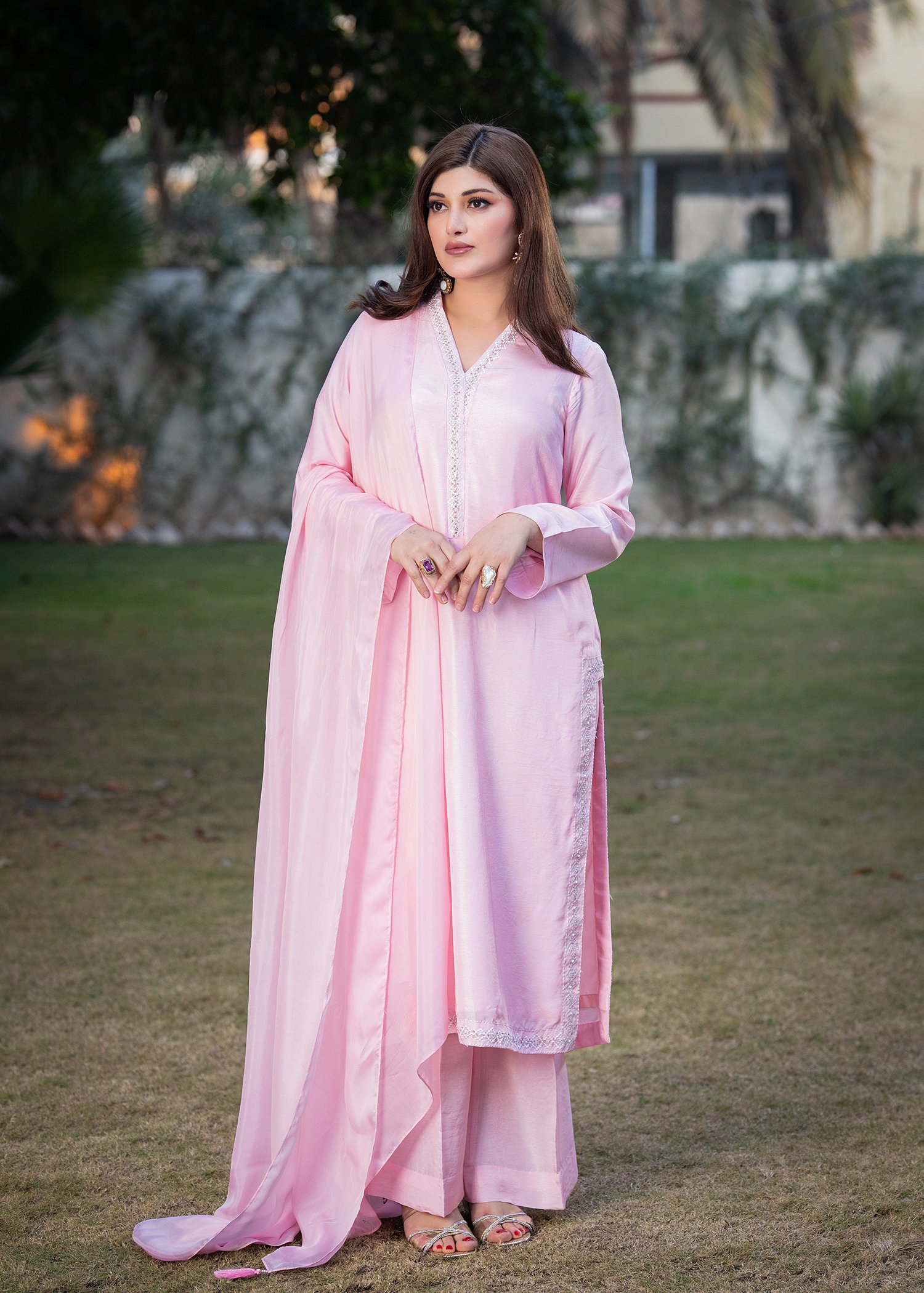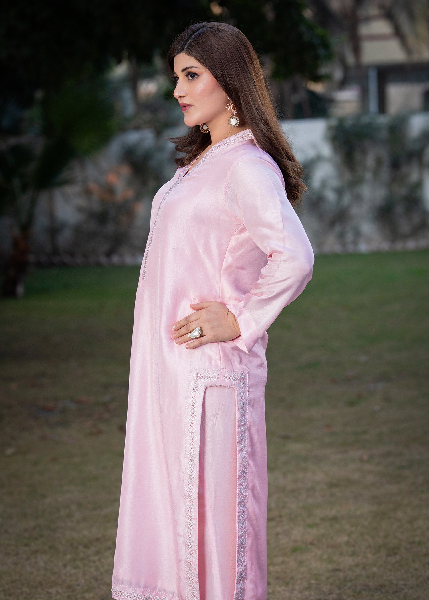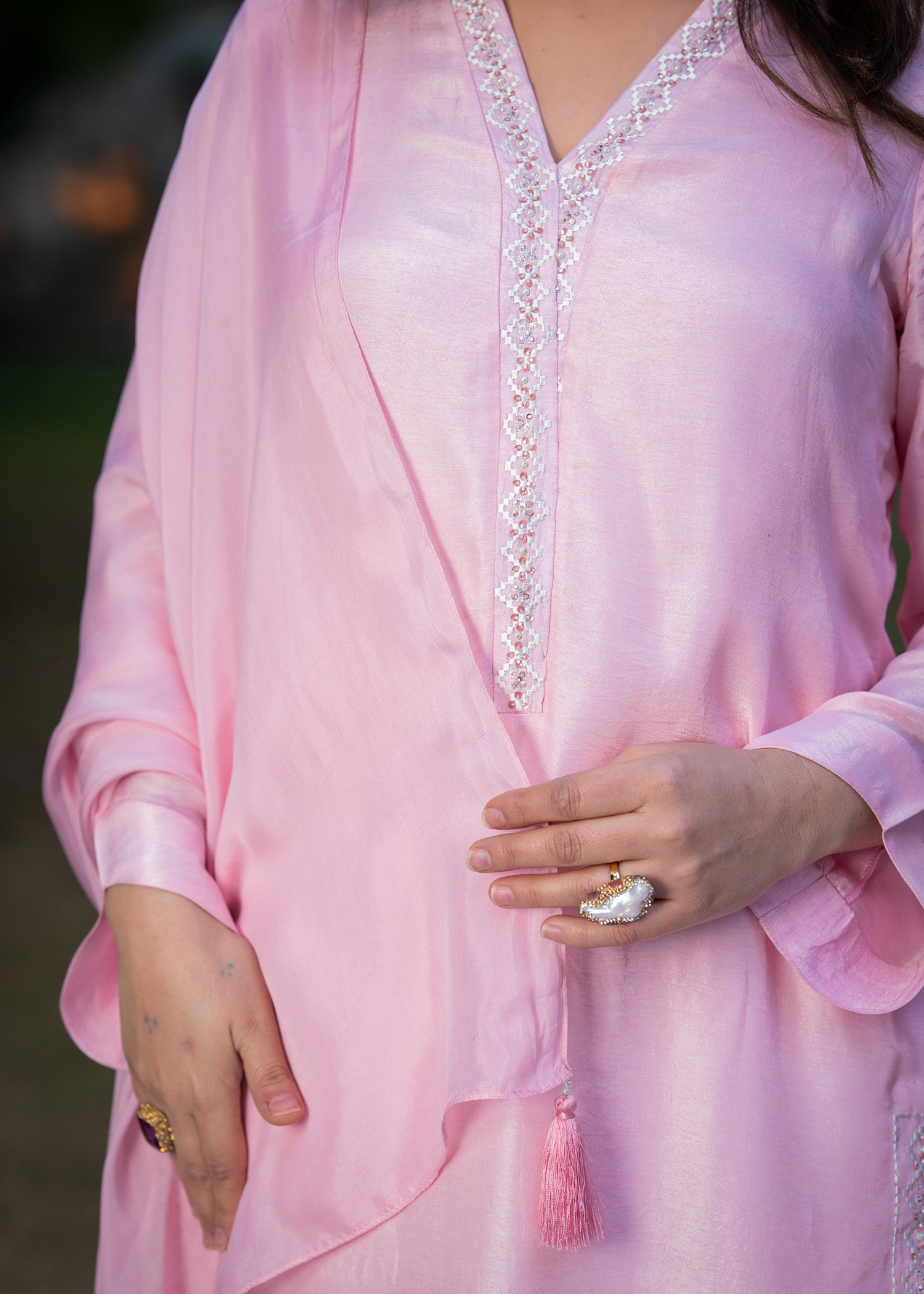 Rendered in a delicate Baby Pink, this ensemble is crafted from smooth Tassels silk with a graceful, fluid drape. Fine machine embroidery frames the neckline and borders, while hand embellishment with cutdana and sequins introduces subtle shimmer with controlled precision.