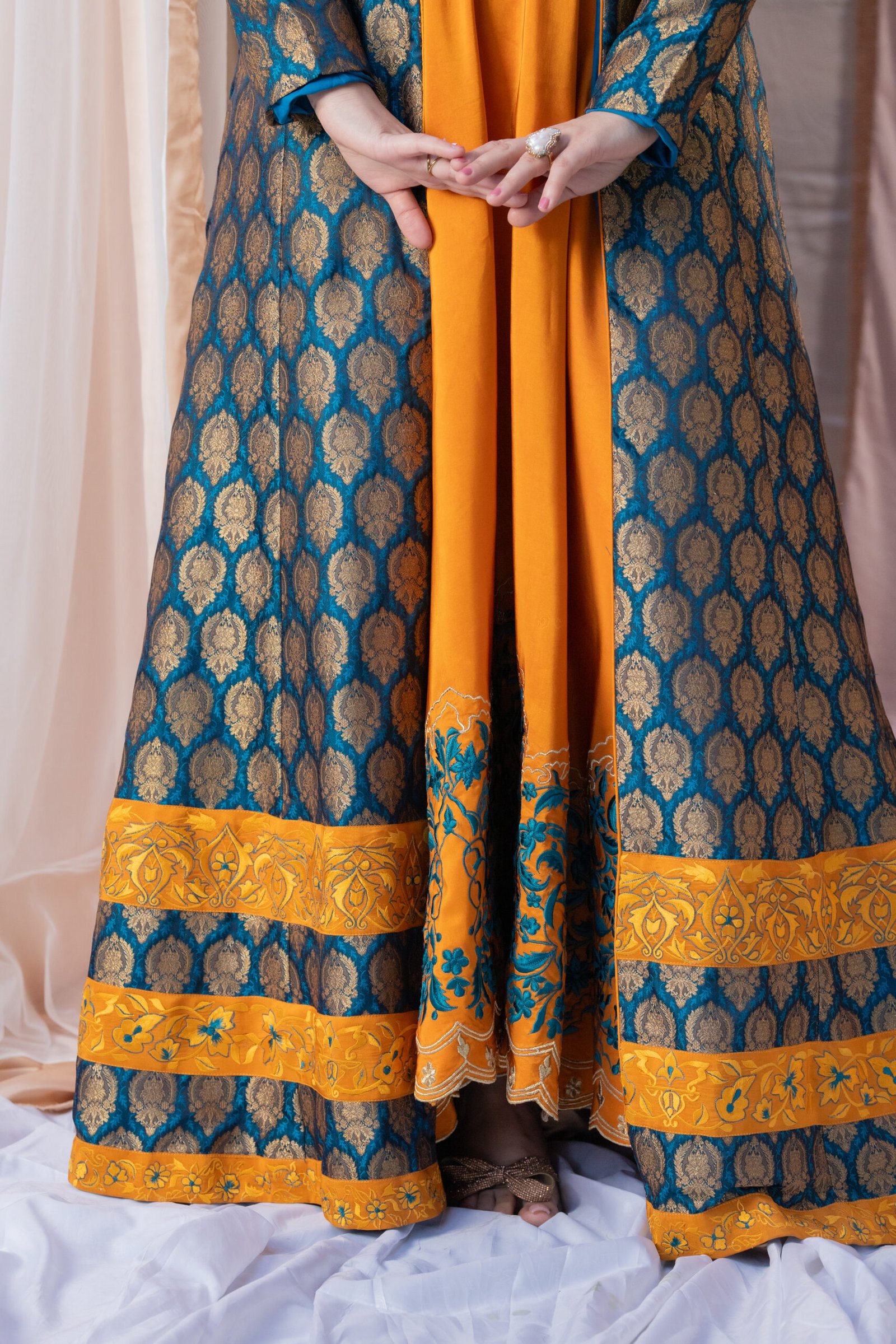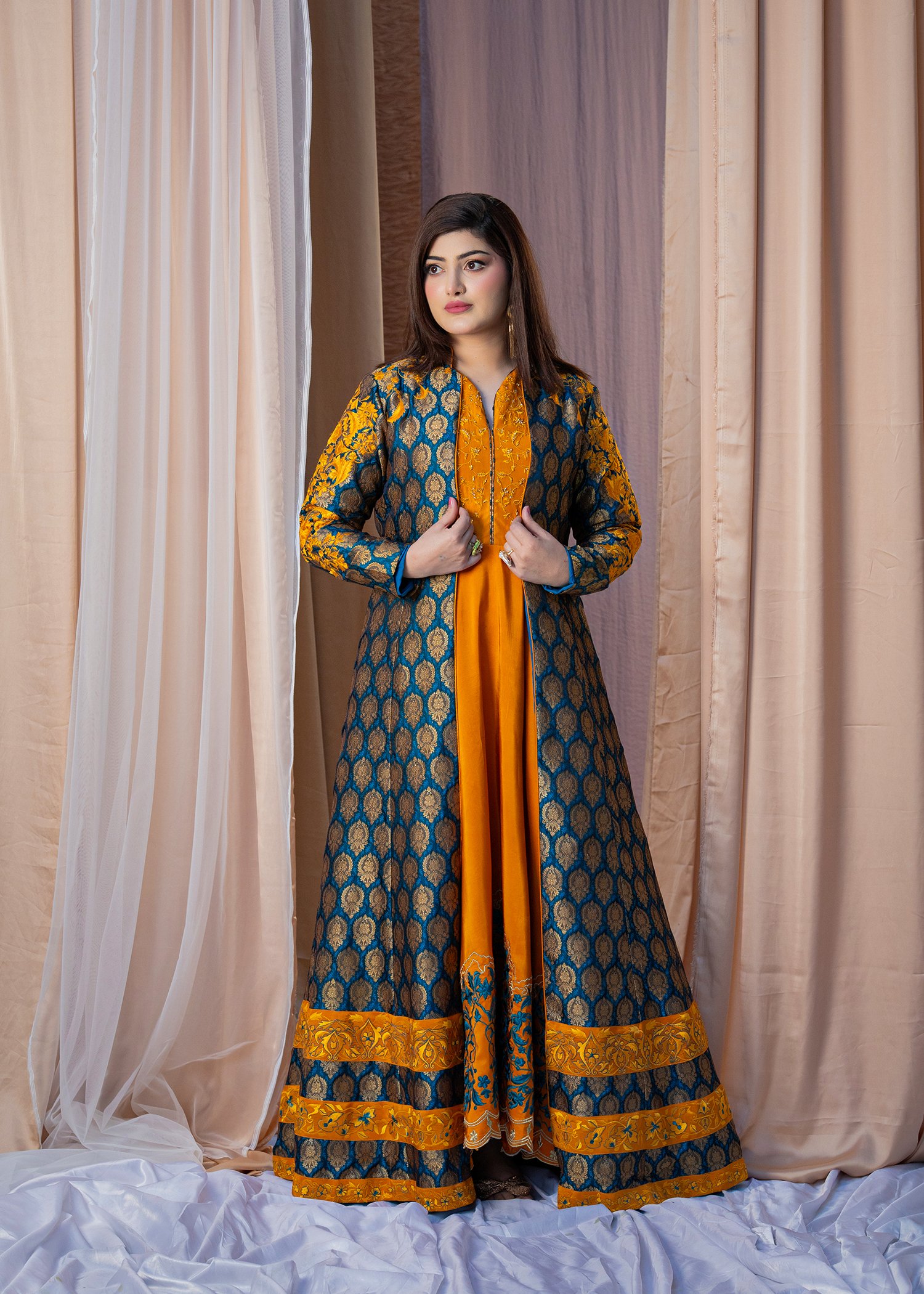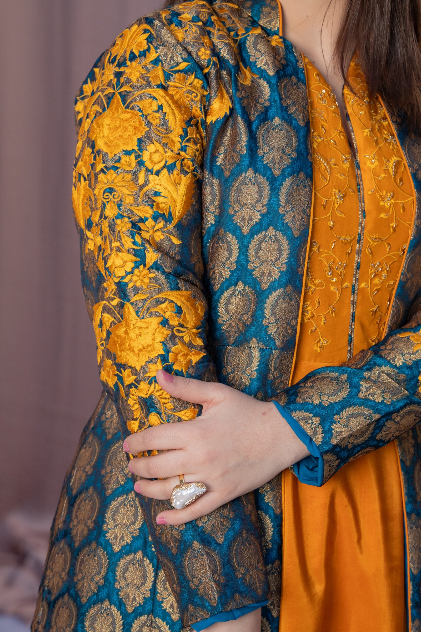 This two-piece ensemble blends tassel silk with rich banaras, creating a striking combination of mustard and zinc tones. The long jacket features intricate machine embroidery enhanced with fine hand embroidery, detailed with katdana and stonework that adds depth and subtle shine. The inner mustard layer complements the banarasi pattern, giving the outfit a regal, structured silhouette.