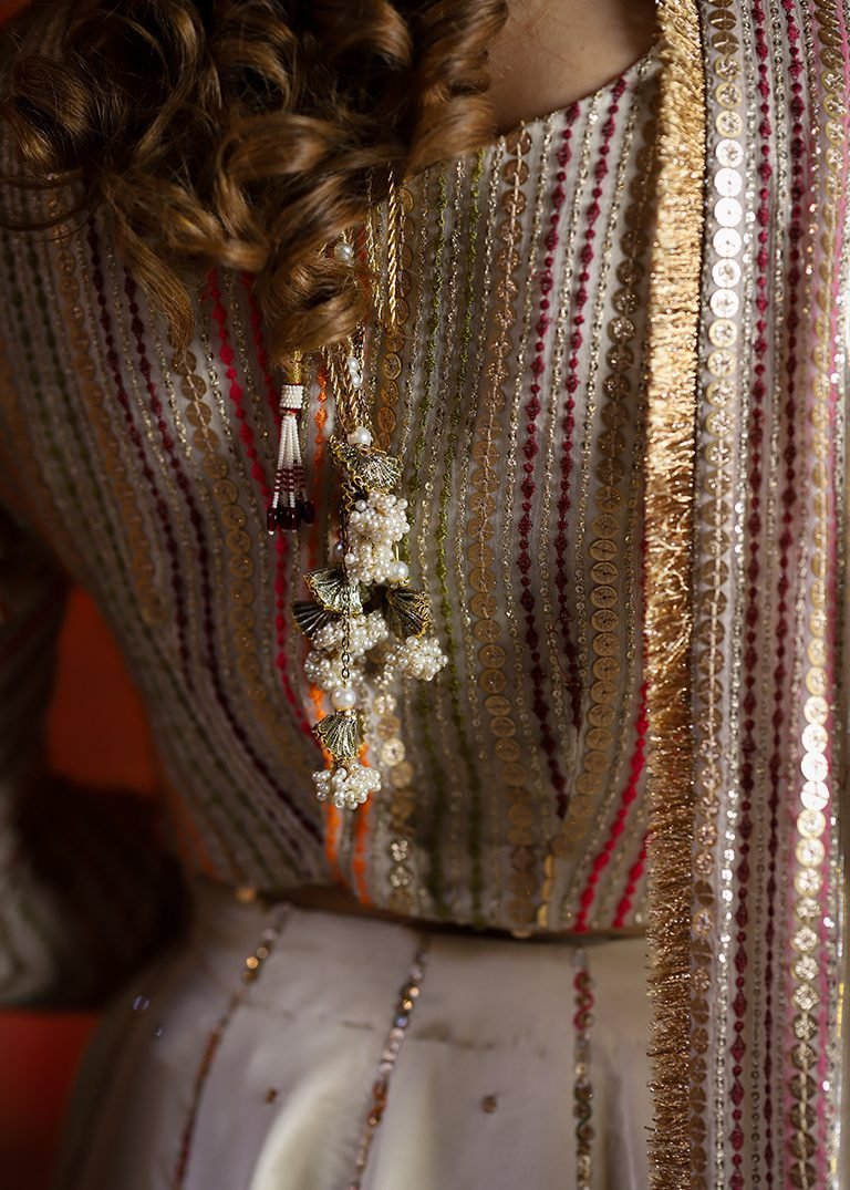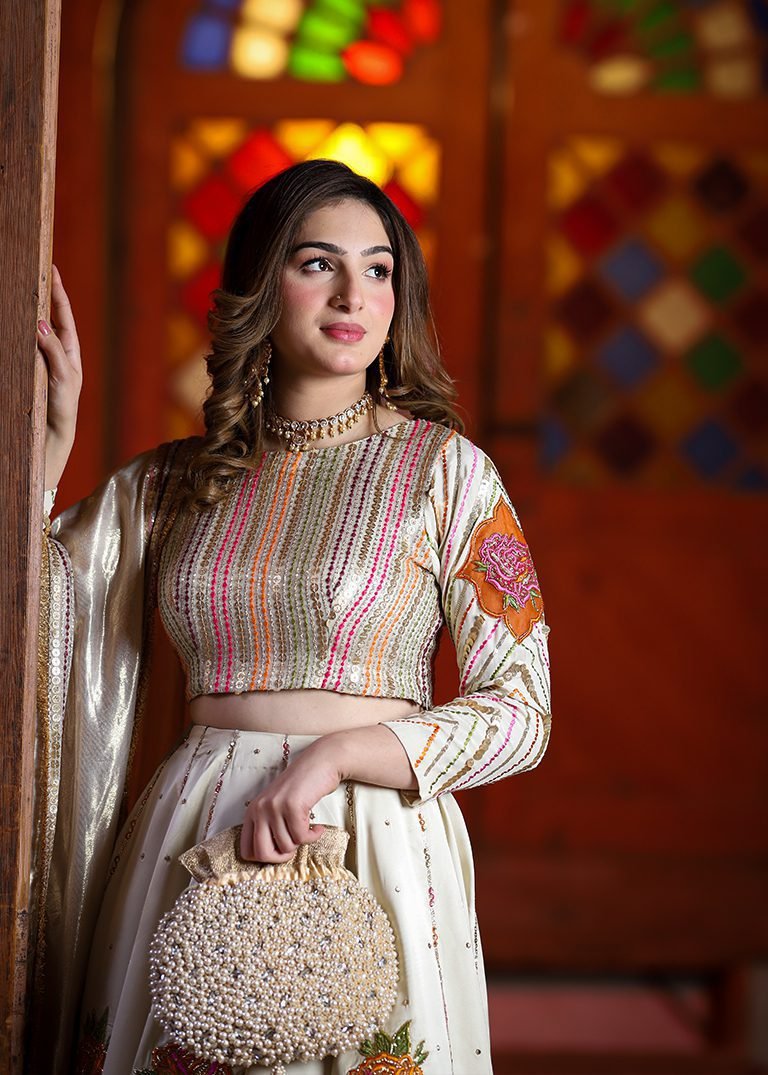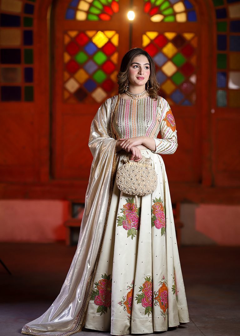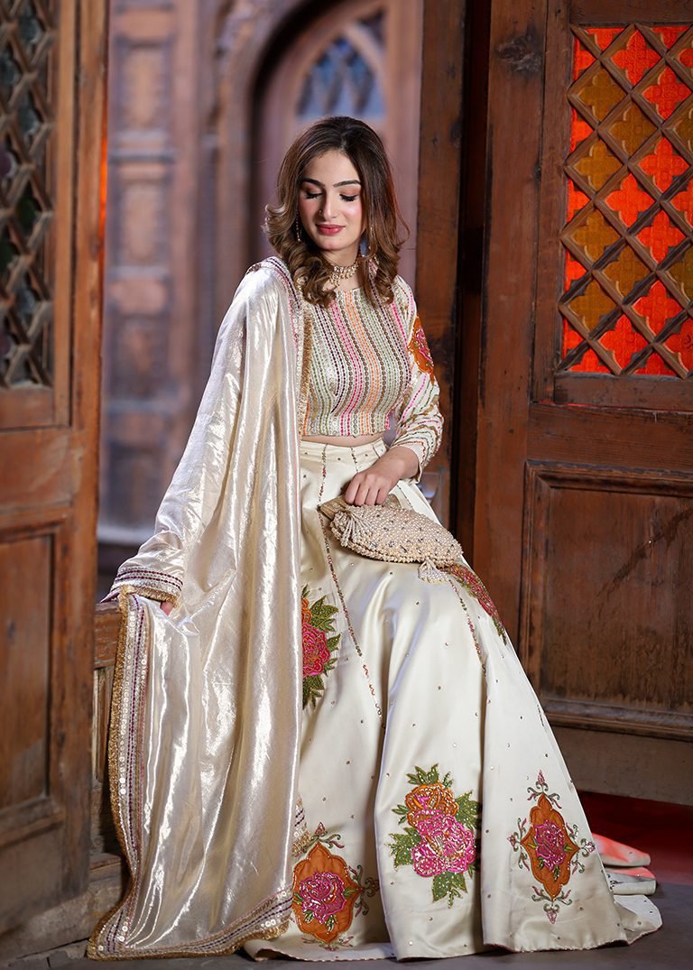 A refined expression of elegance. Delicate appliqué, cutdana, and sequin work come together on a graceful ivory palette, finished with a masoori dupatta for timeless sophistication. Designed for moments that call for understated luxury.