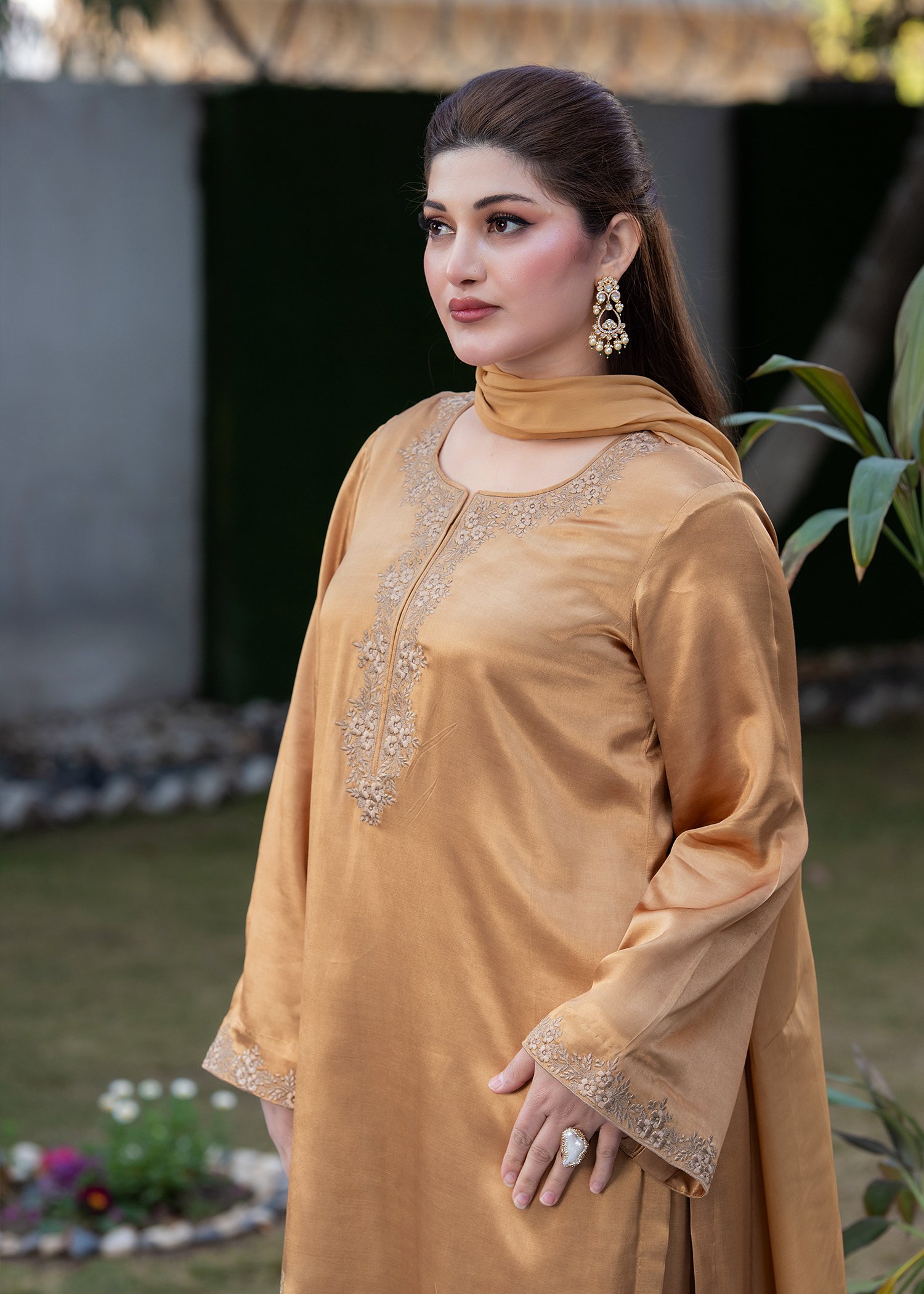 Crafted in a rich Dark Brown shade, this ensemble is tailored from smooth Shamosh silk for a structured yet comfortable fall. Fine machine embroidery executed with resham thread enhances the neckline, sleeves, and hem with defined motifs that add texture without excess.