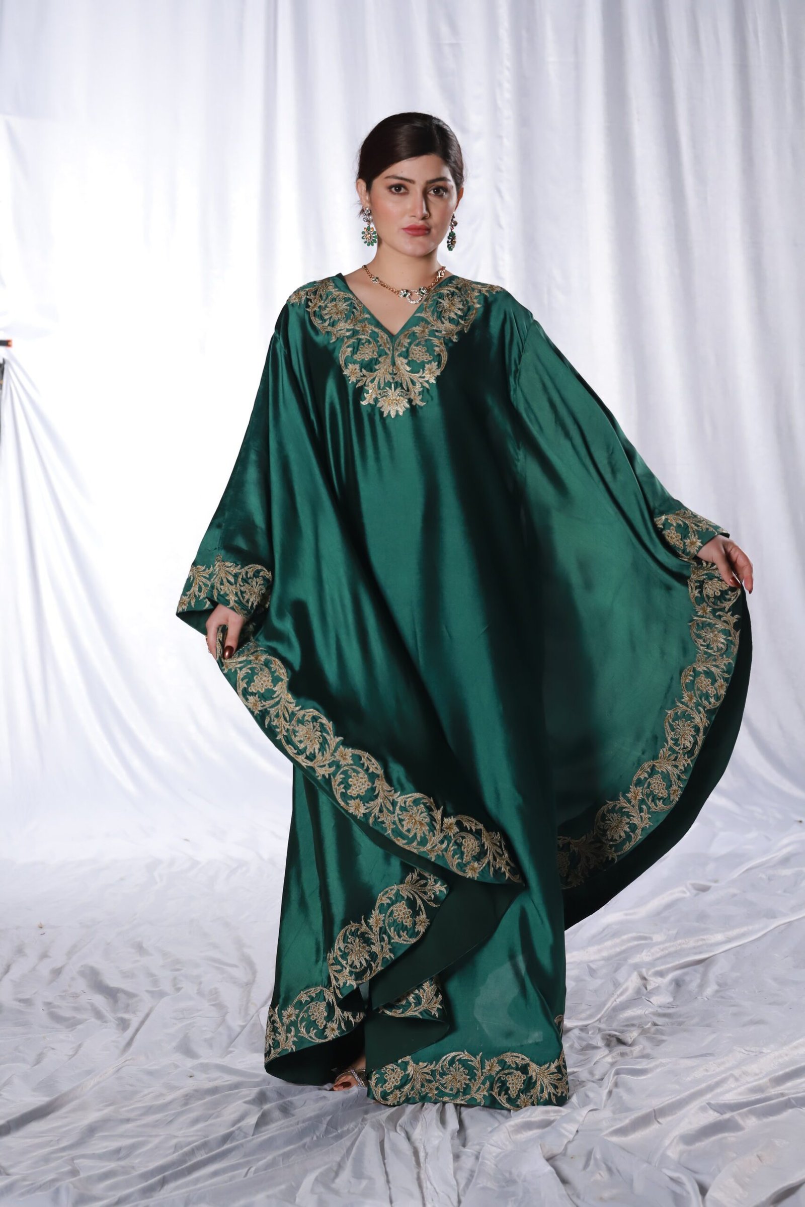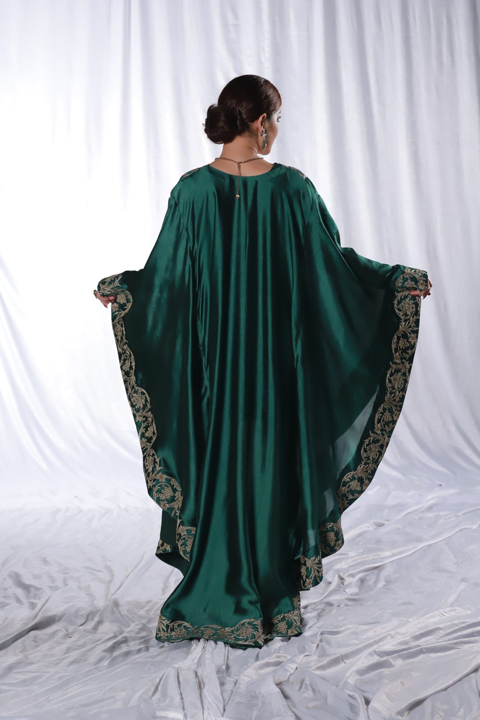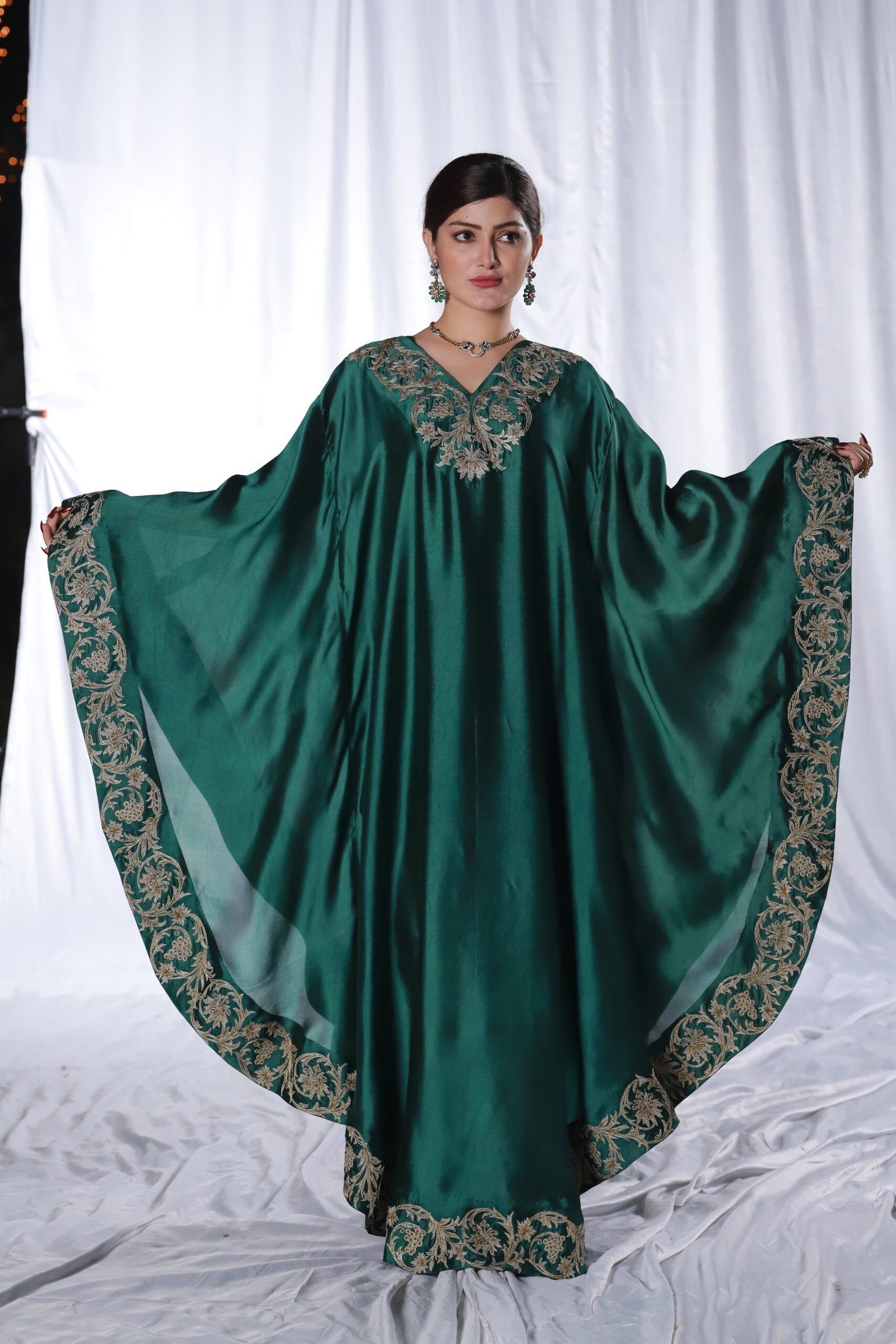 This two-piece dark green kaftan set is crafted from fluid, glossy fabric that drapes beautifully. The neckline and wide borders feature detailed machine embroidery with tila and resham, creating elegant, flowing motifs that frame the silhouette. The loose, cape-style cut adds movement and ease, making it a graceful choice for festive evenings and formal gatherings.