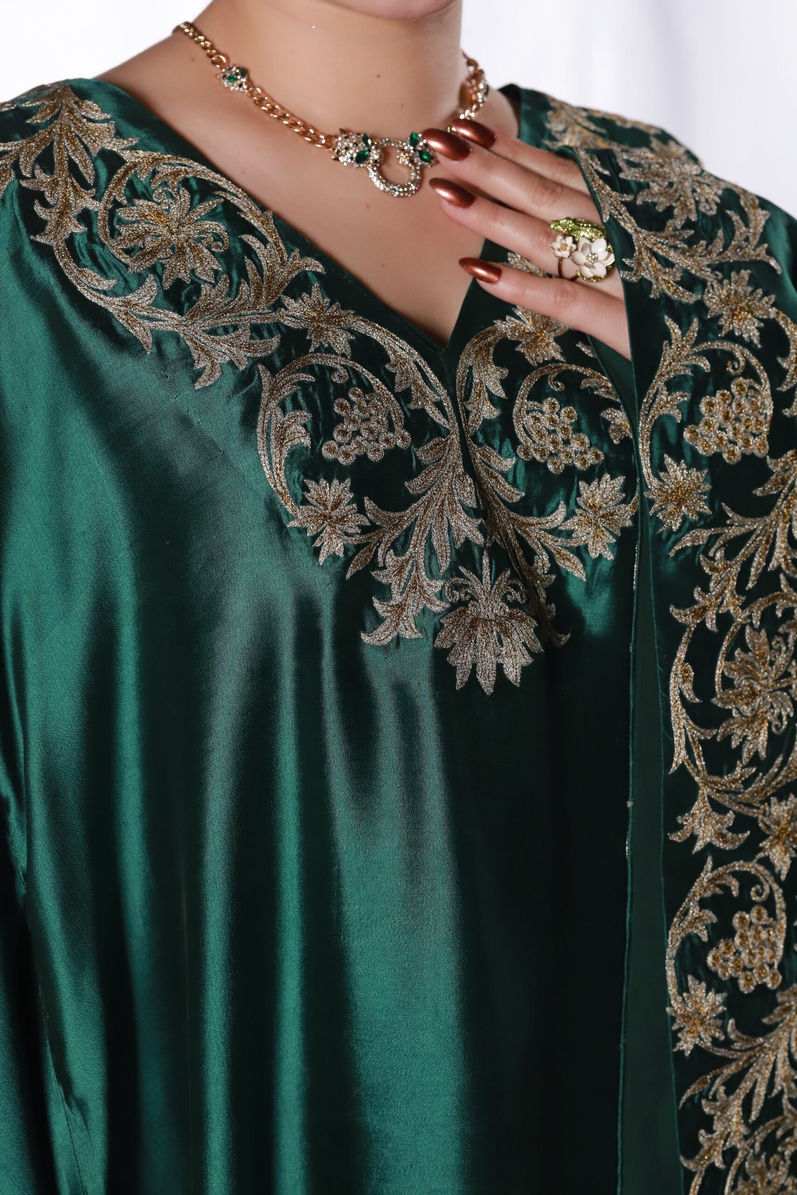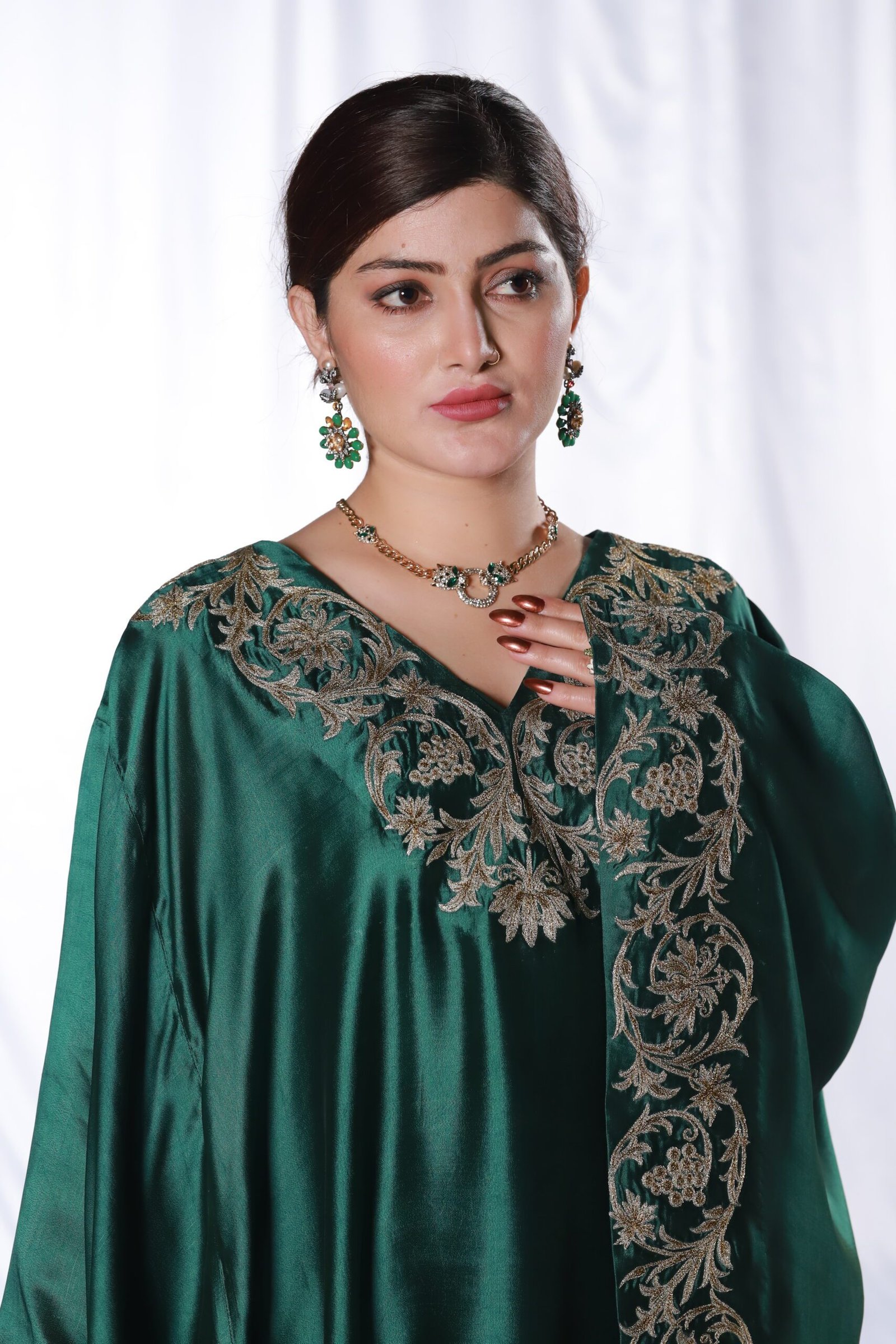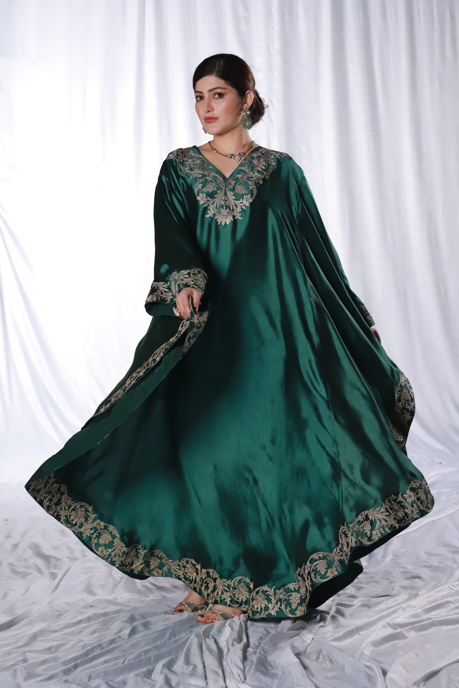 This two-piece dark green kaftan set is crafted from fluid, glossy fabric that drapes beautifully. The neckline and wide borders feature detailed machine embroidery with tila and resham, creating elegant, flowing motifs that frame the silhouette. The loose, cape-style cut adds movement and ease, making it a graceful choice for festive evenings and formal gatherings.