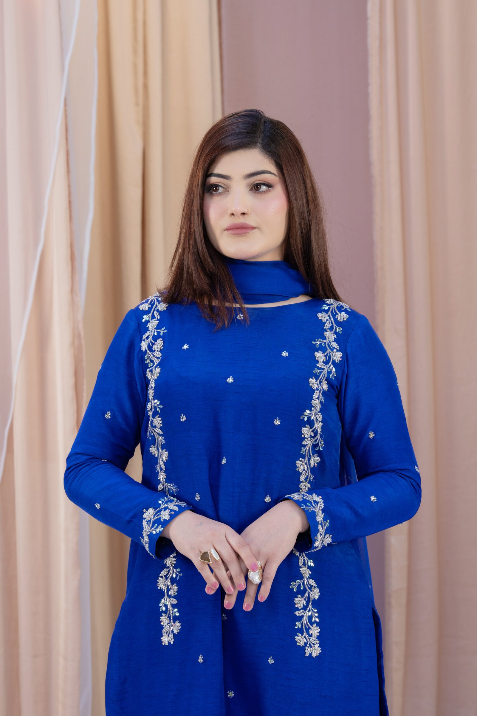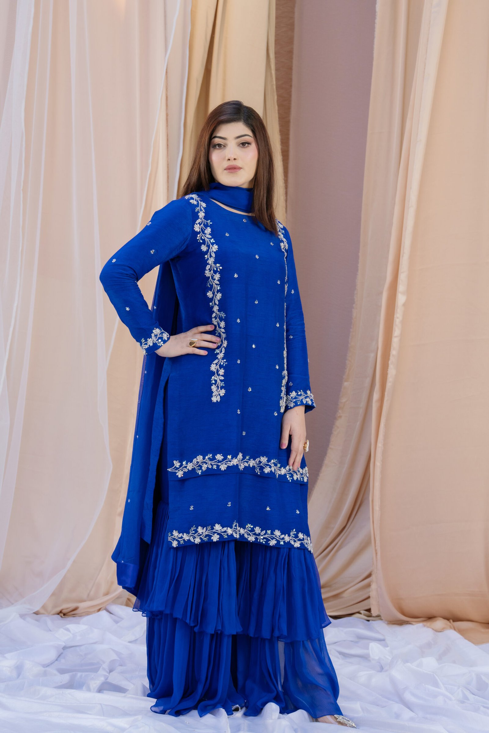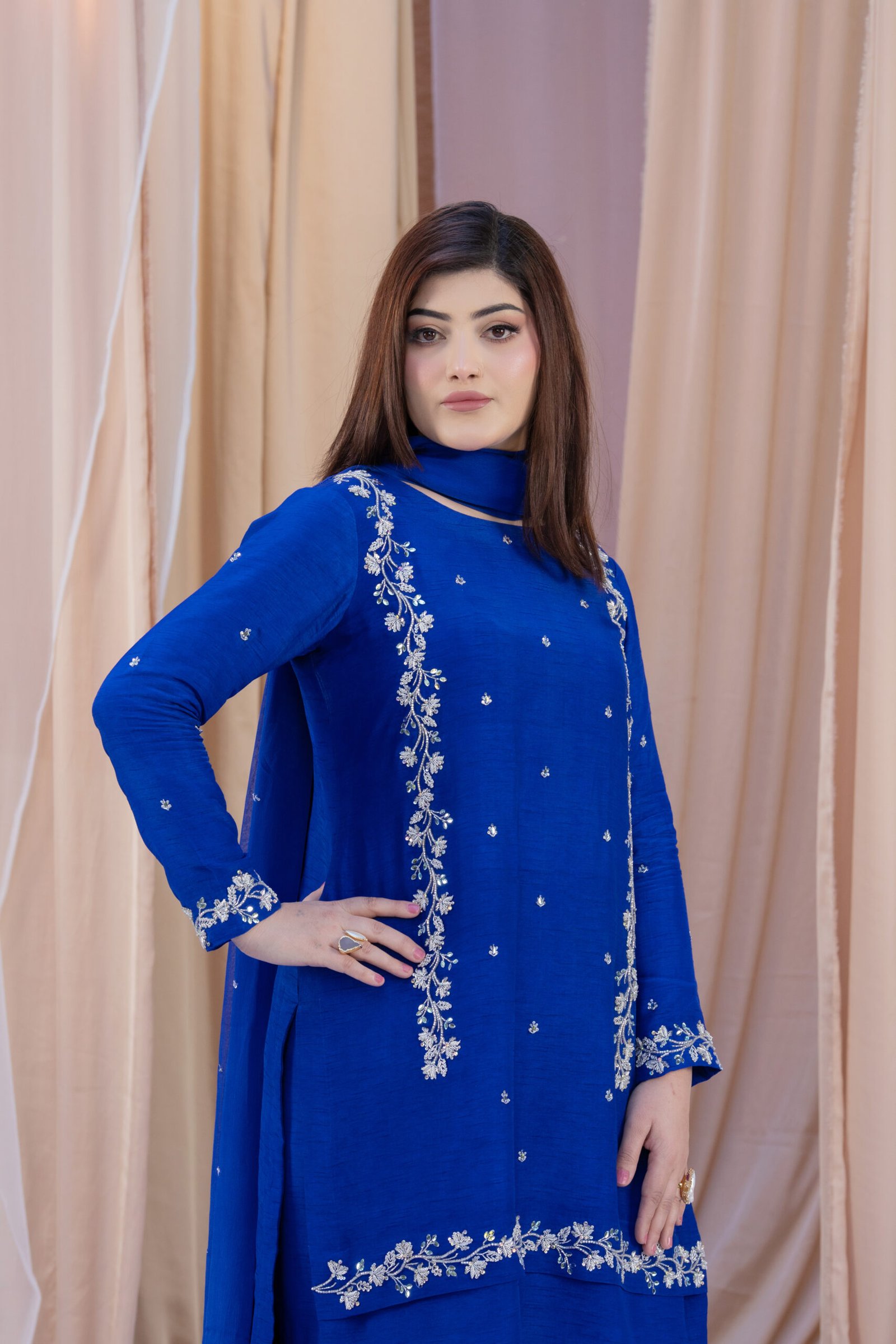 This three-piece set in blueberry blue blends Koren silk with a soft chiffon dupatta for a refined, elegant look. The shirt features delicate hand embroidery with dhabka, katdana, sequins, and stones, adding subtle sparkle along the neckline, sleeves, and hem. The coordinated dupatta carries light embellishment along the borders, completing the outfit with a polished finish.