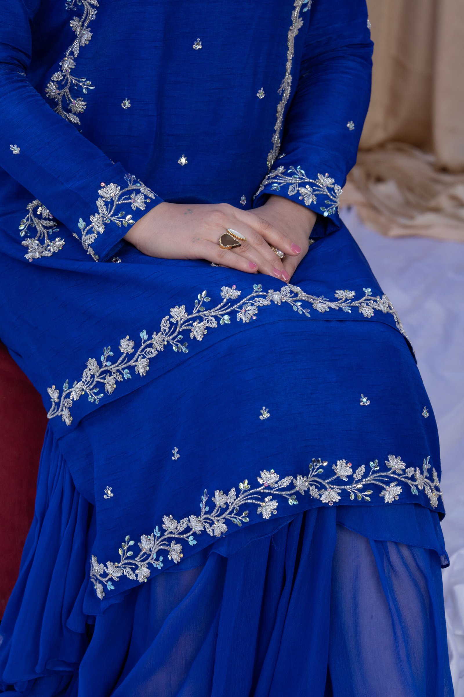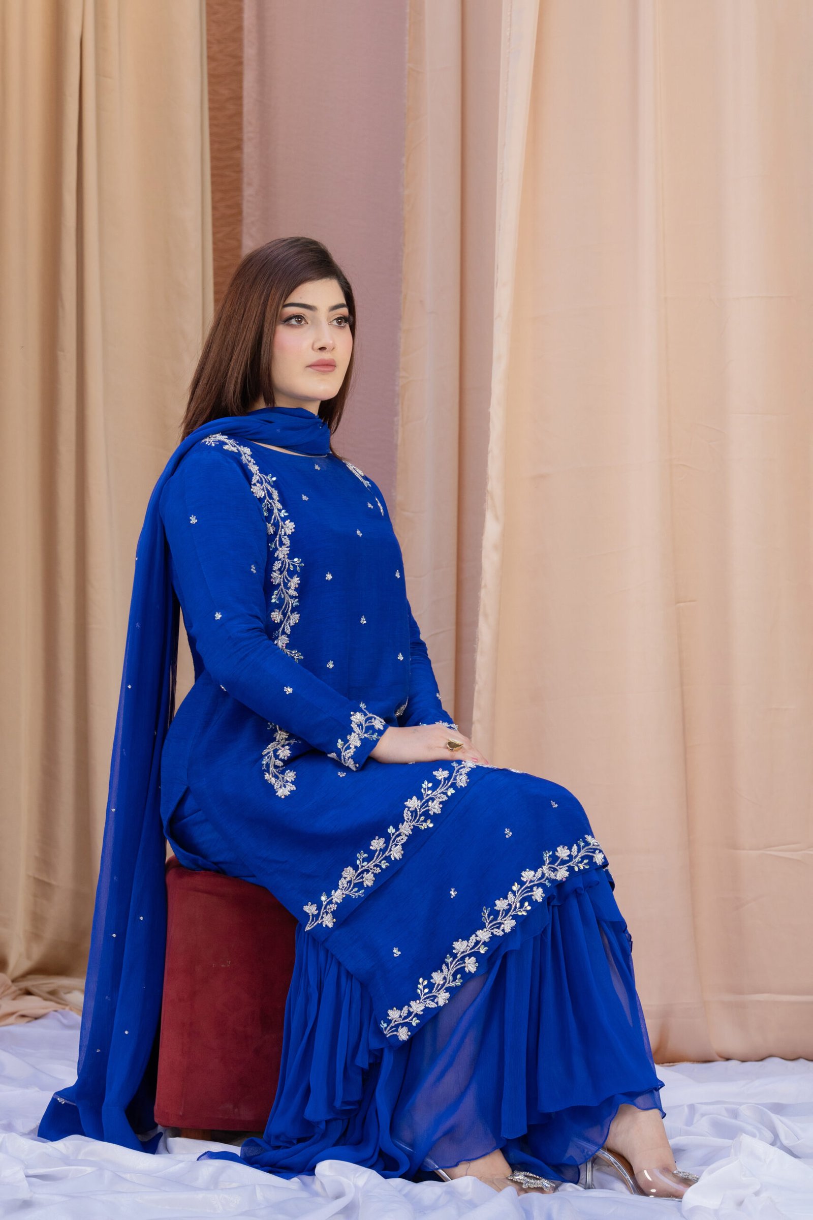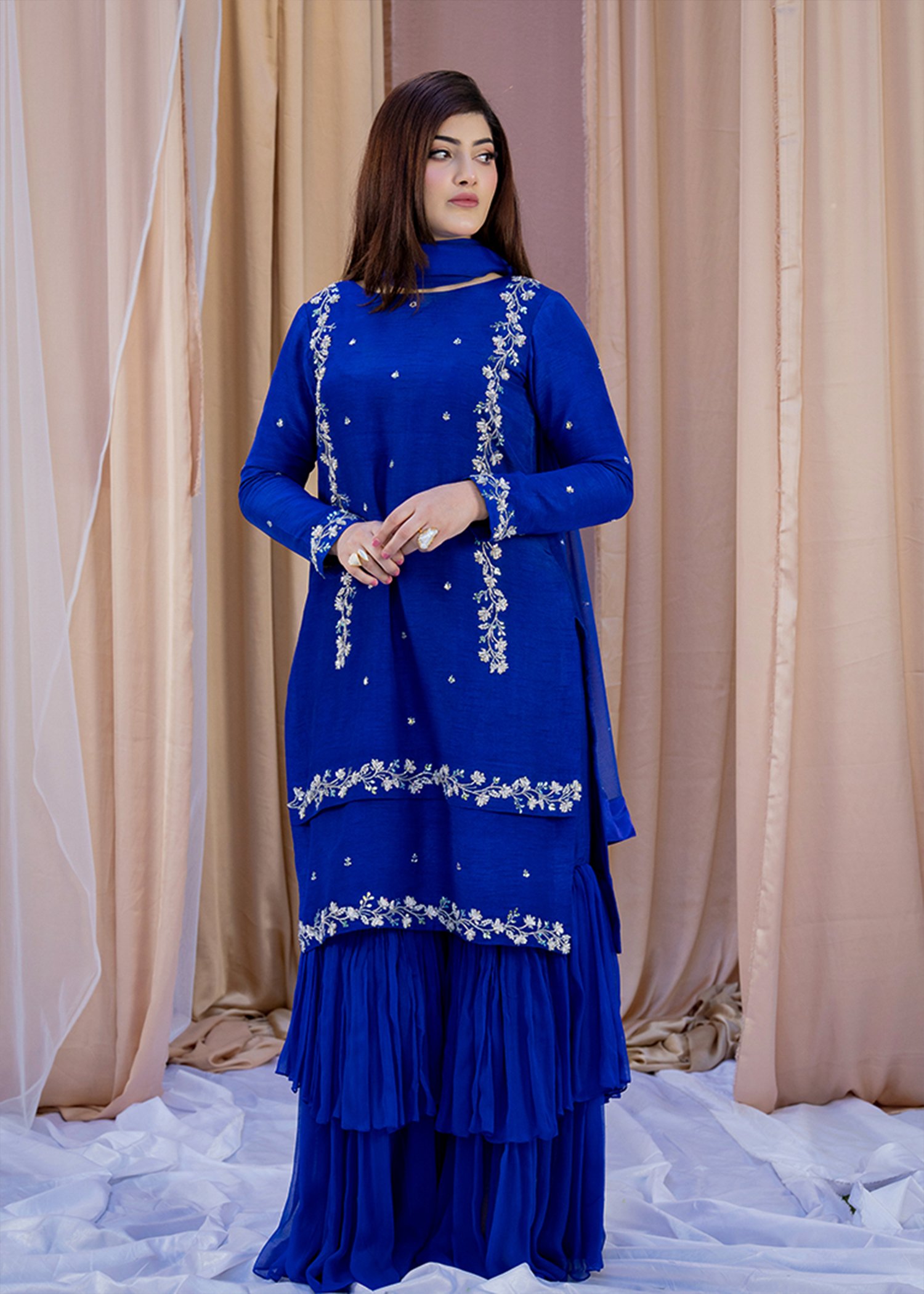 This three-piece set in blueberry blue blends Koren silk with a soft chiffon dupatta for a refined, elegant look. The shirt features delicate hand embroidery with dhabka, katdana, sequins, and stones, adding subtle sparkle along the neckline, sleeves, and hem. The coordinated dupatta carries light embellishment along the borders, completing the outfit with a polished finish.