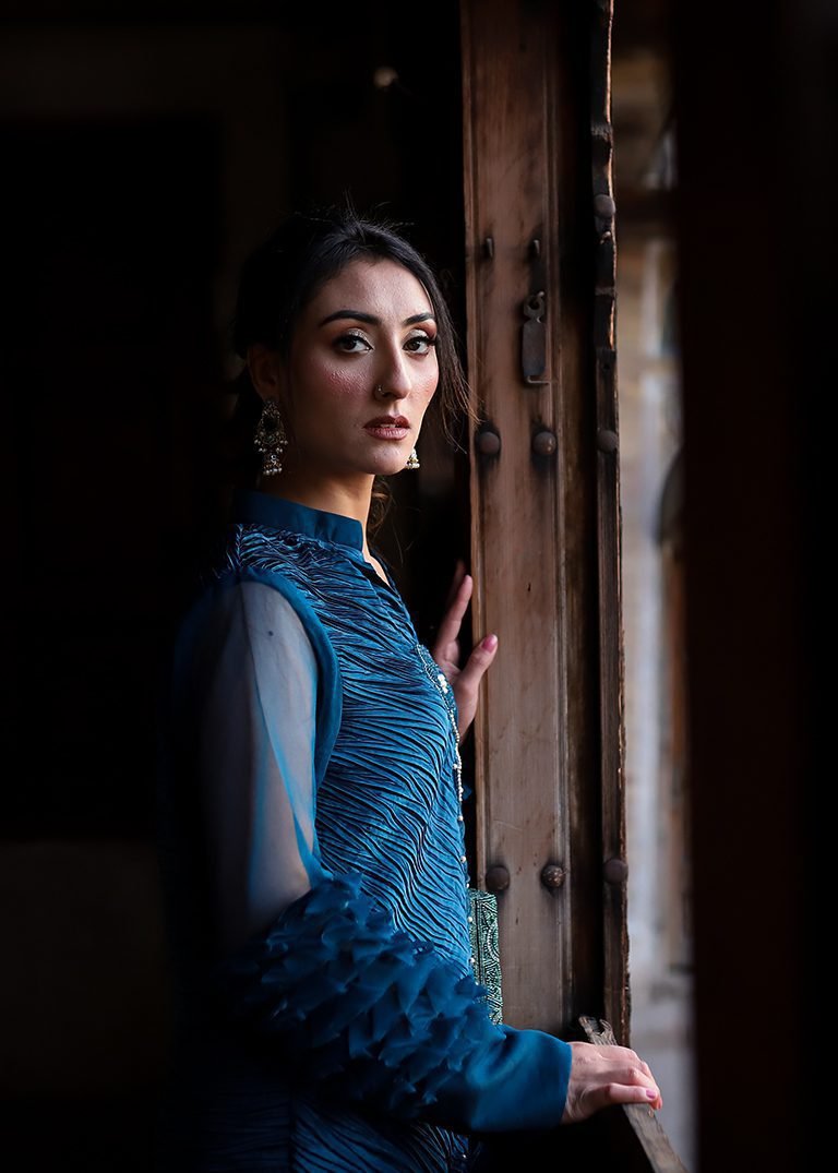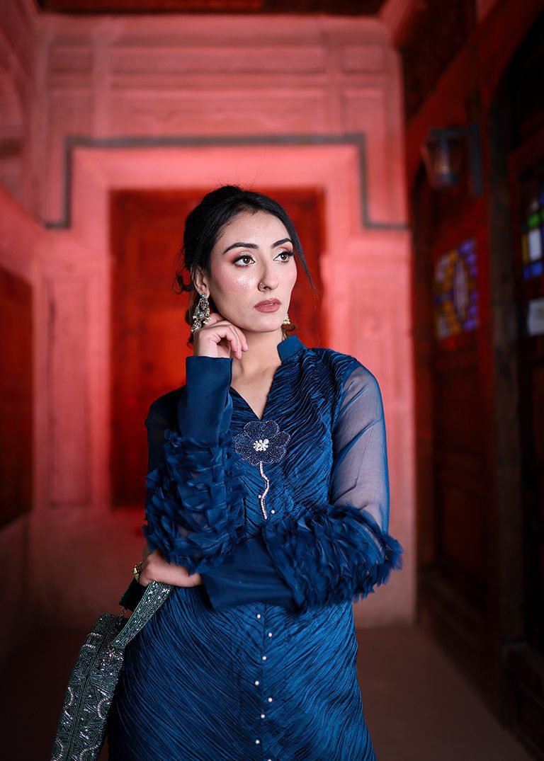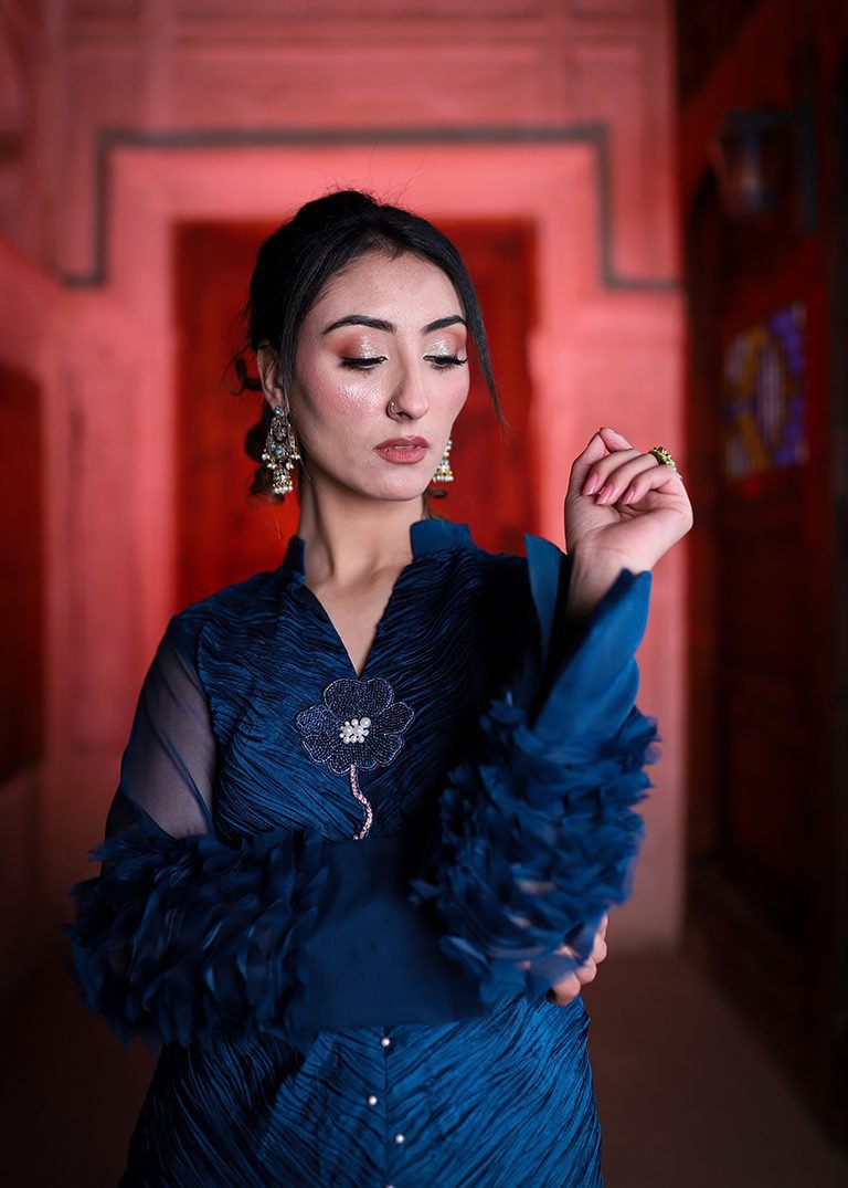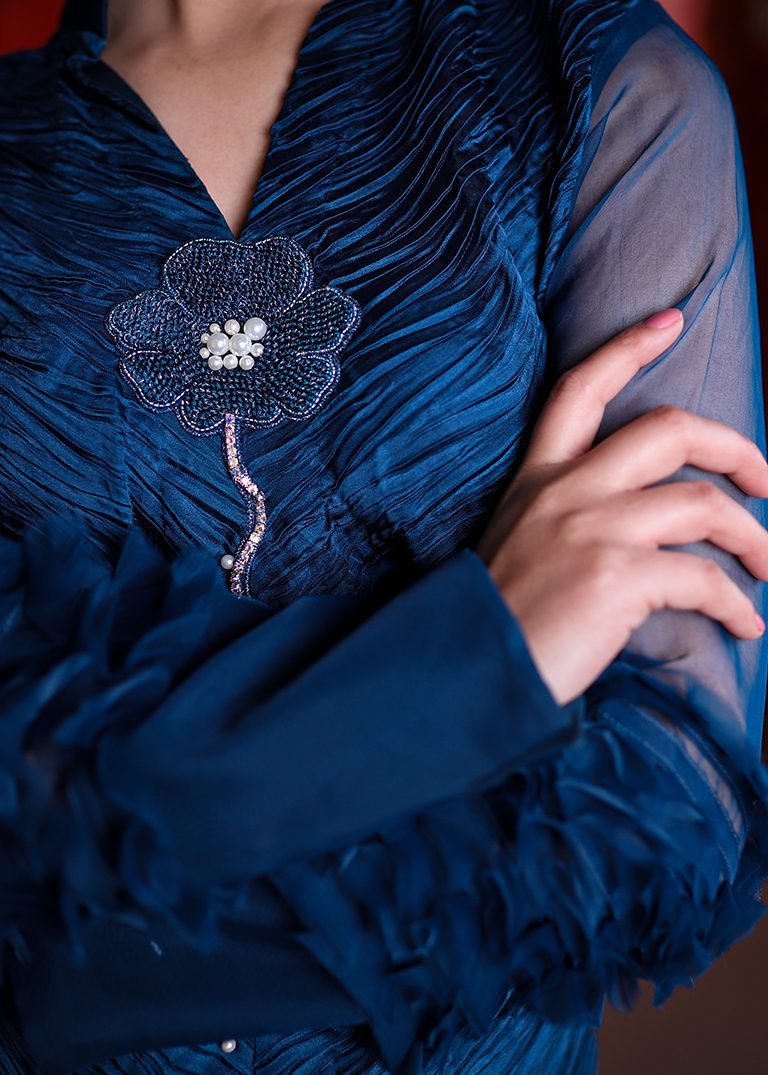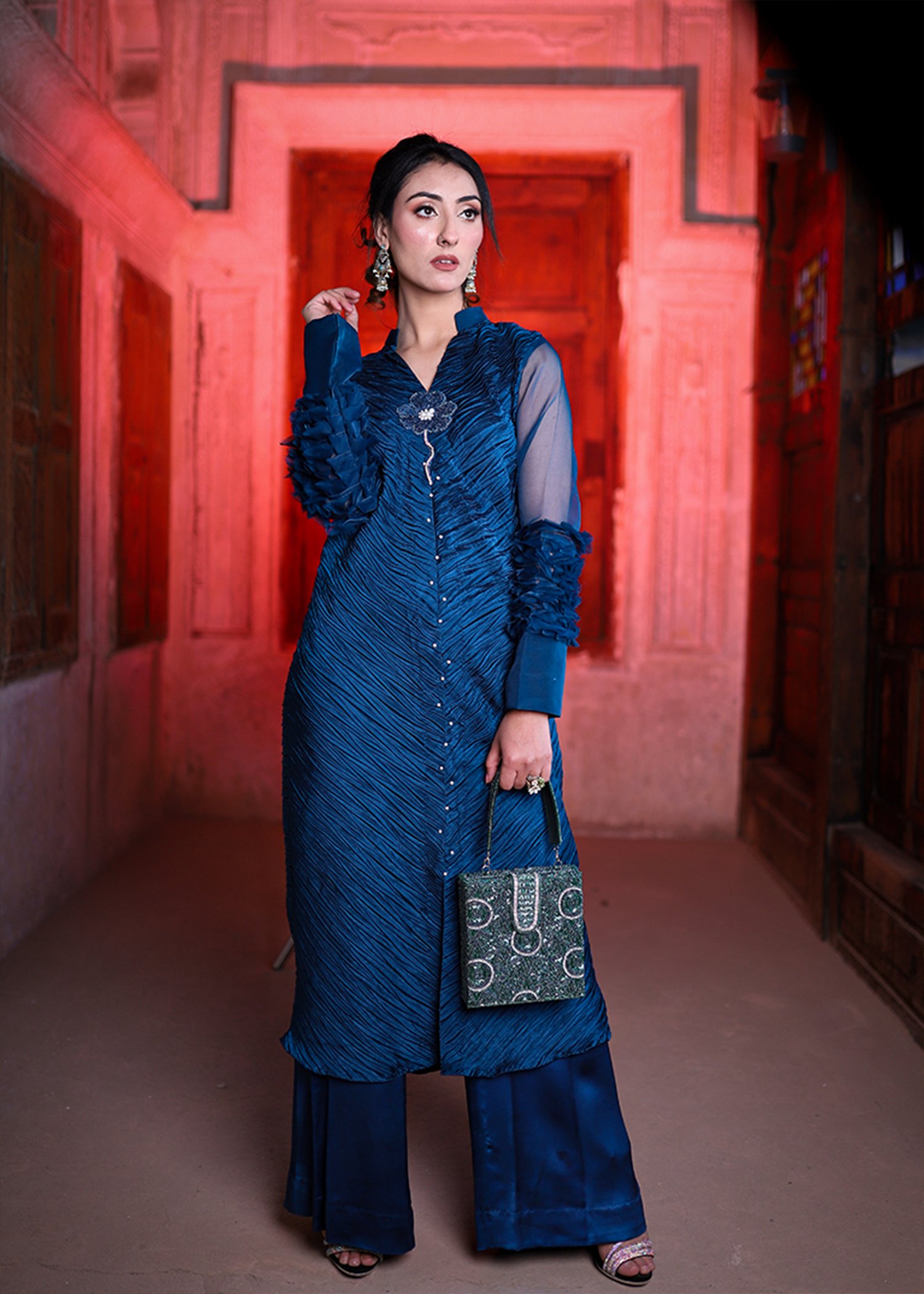 A teal two-piece outfit designed with sequin and pearl embellishment, enhanced by fabric manipulation throughout. Made in organza crush silk for a lightweight yet statement finish.