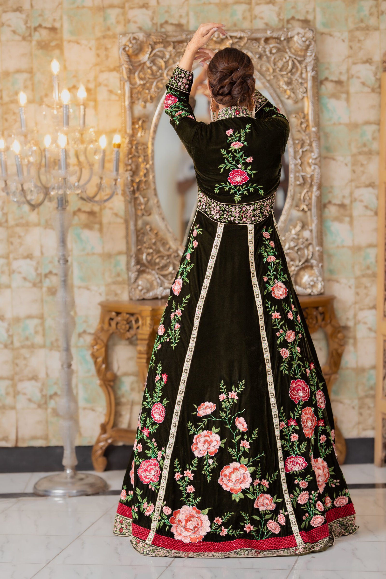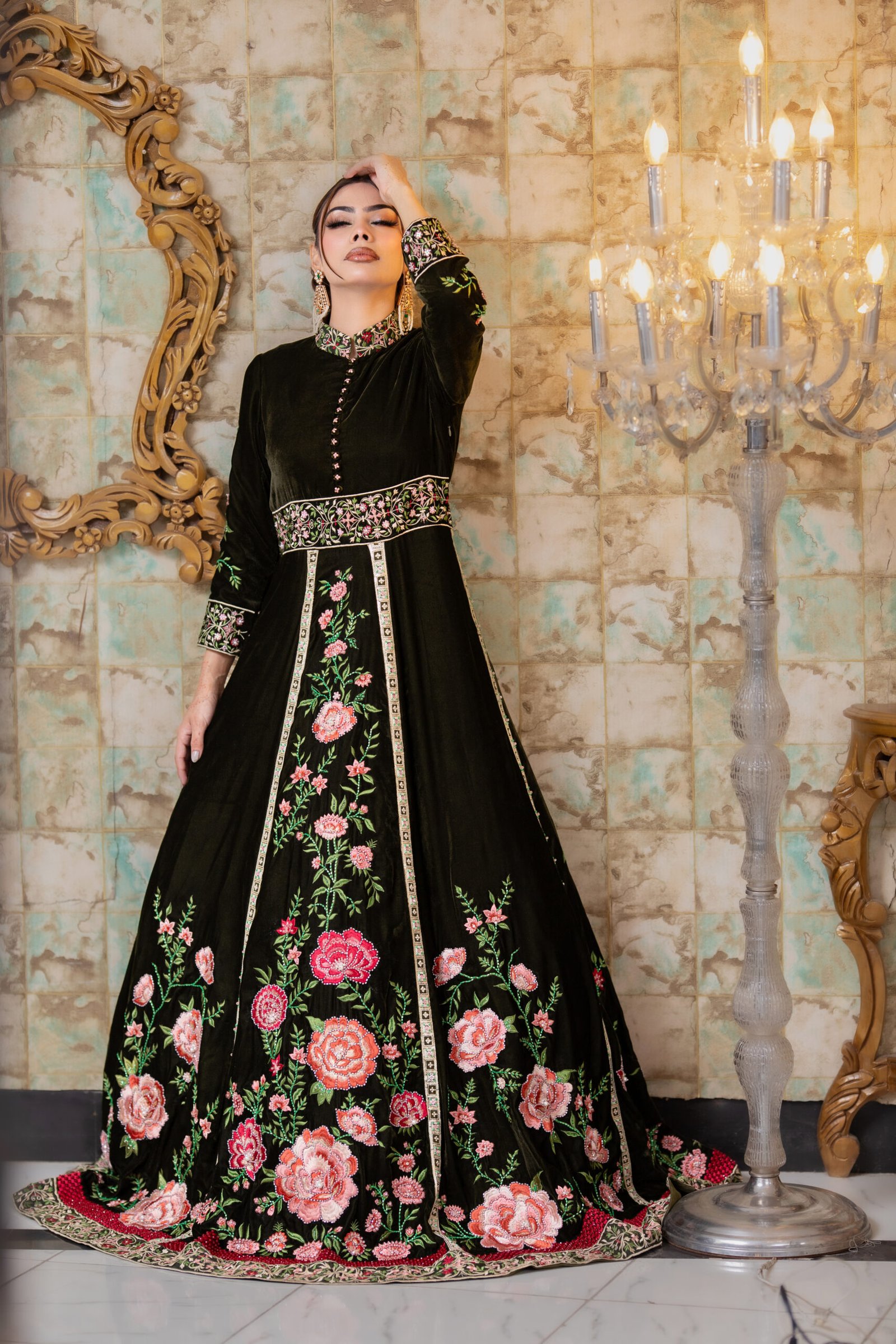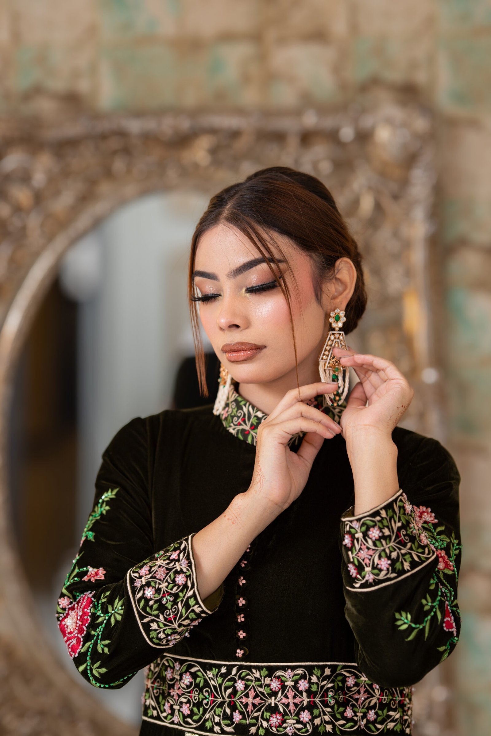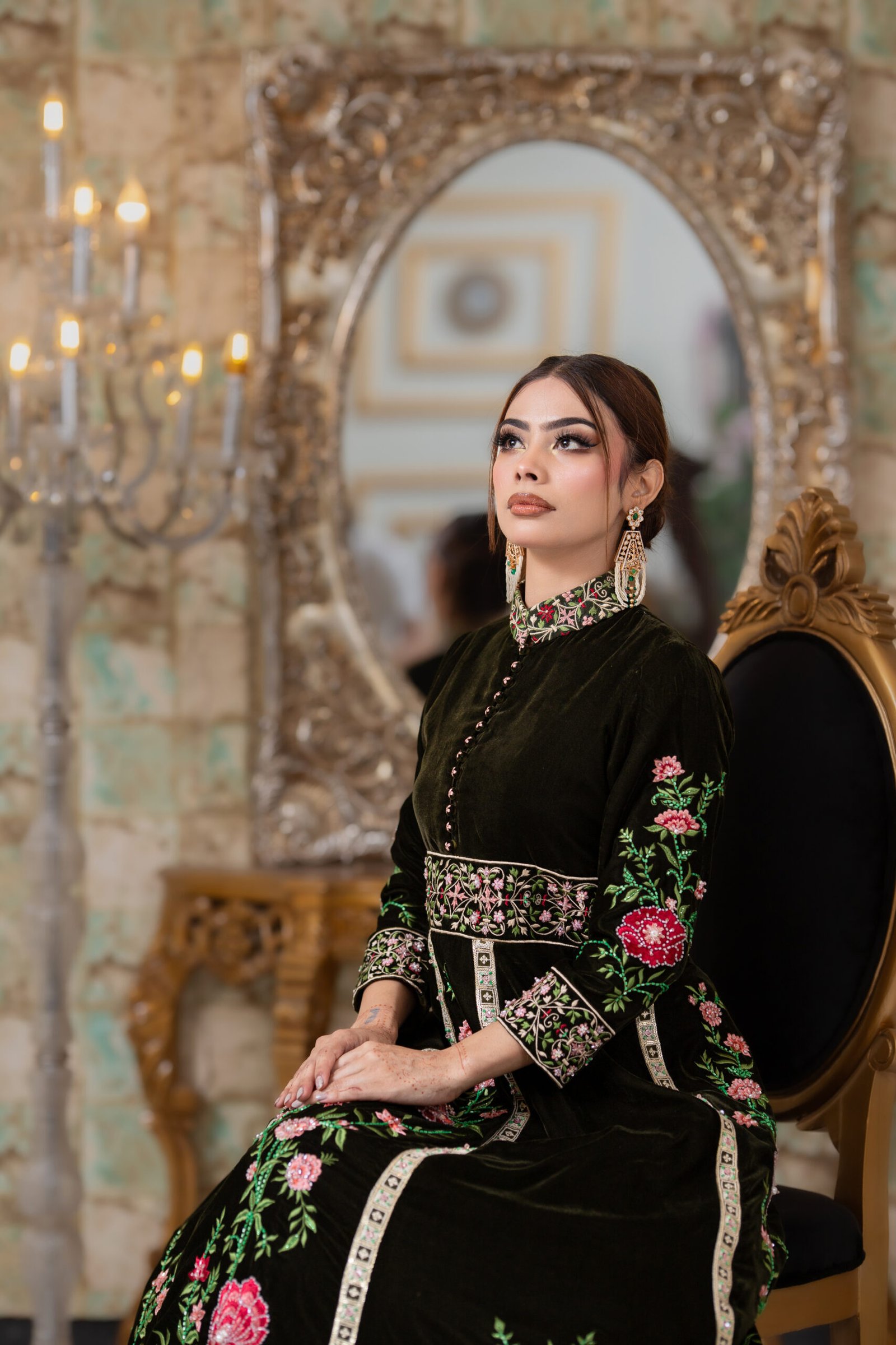 Deep olive green velvet one-piece with precision machine embroidery. Embellished with katdana, sequins, pearls, and crystals for refined luminance. Features an ornate neckline, detailed sleeves, and a gracefully structured silhouette. Ideal for formal receptions and high-end festive occasions.