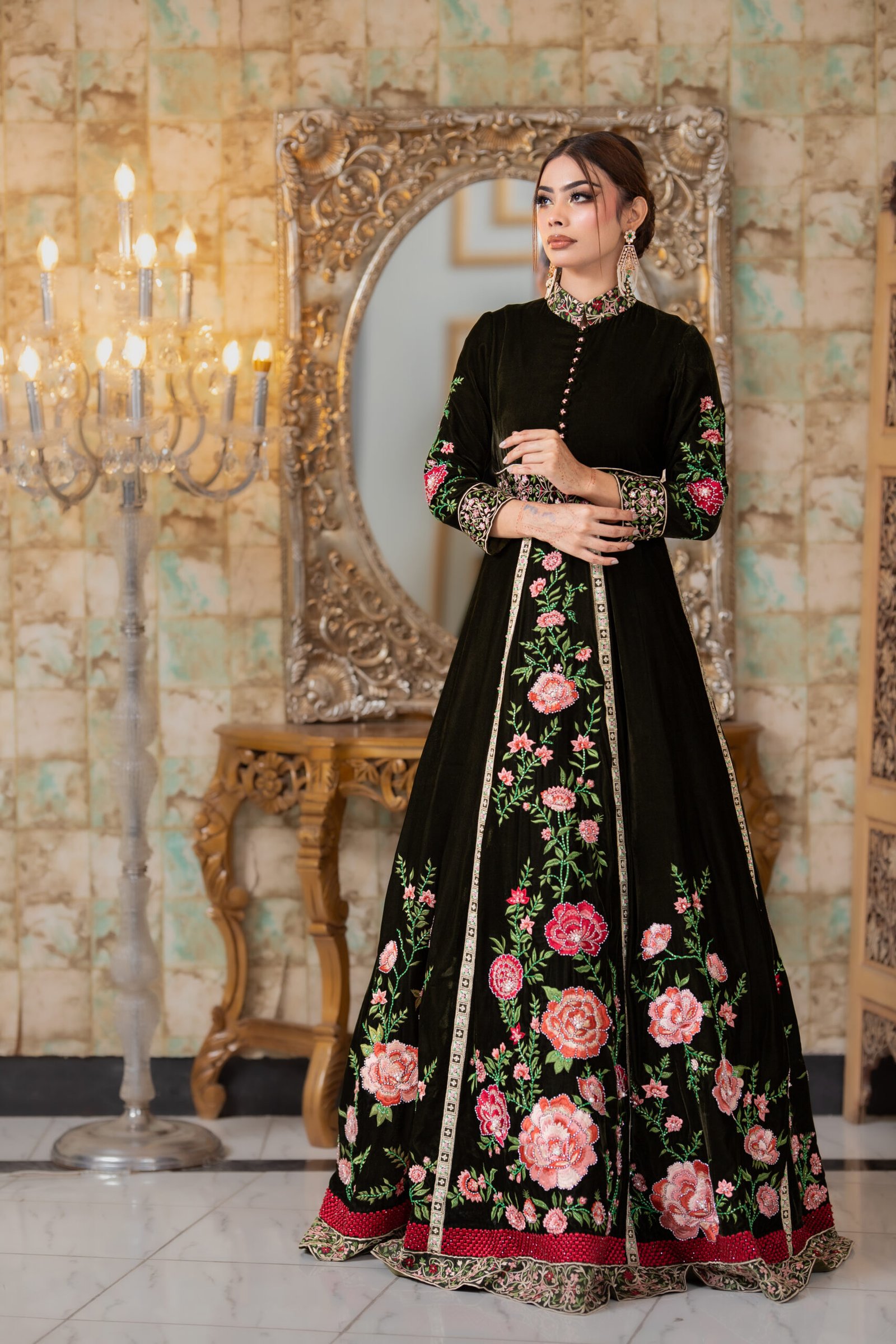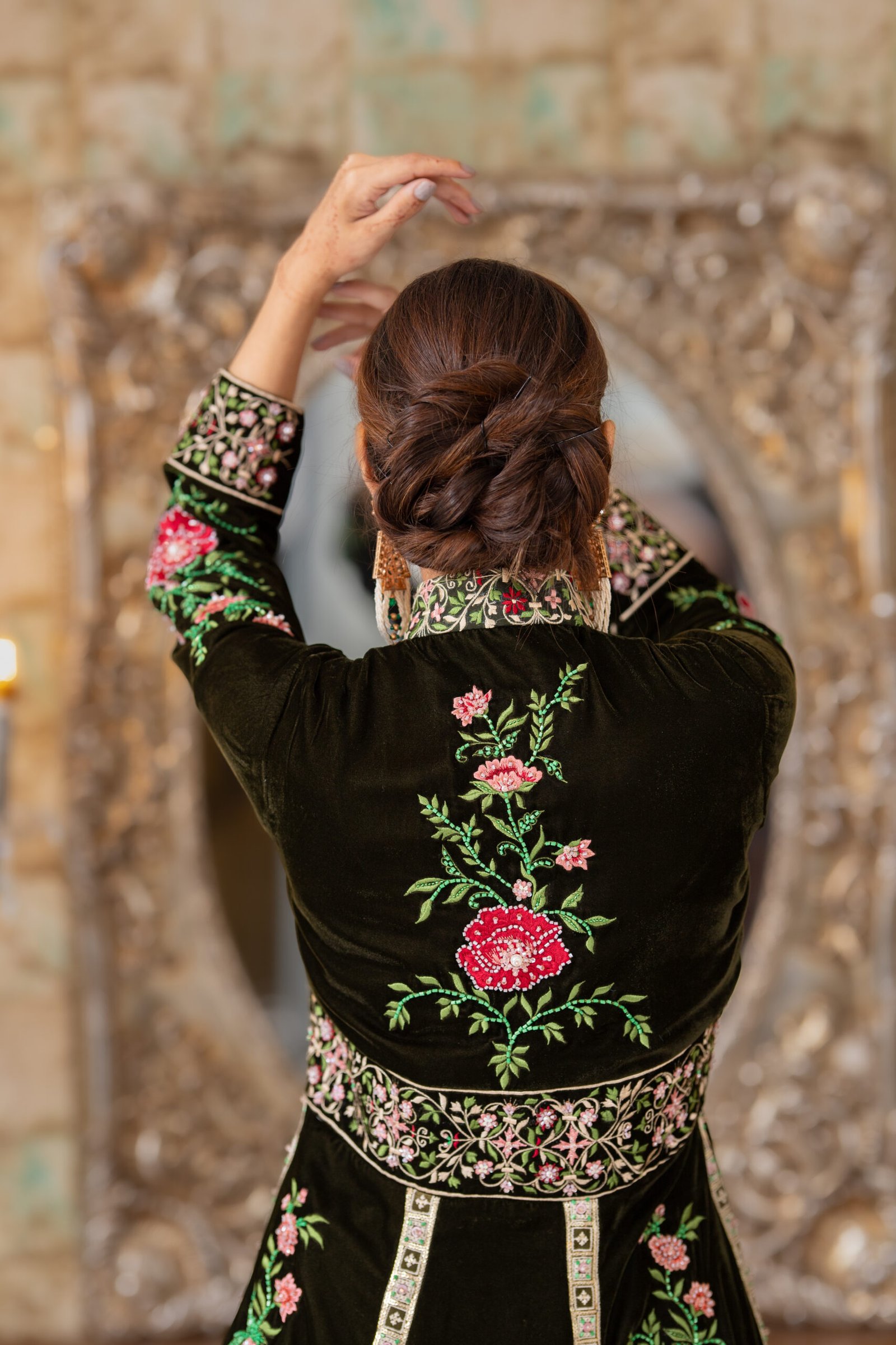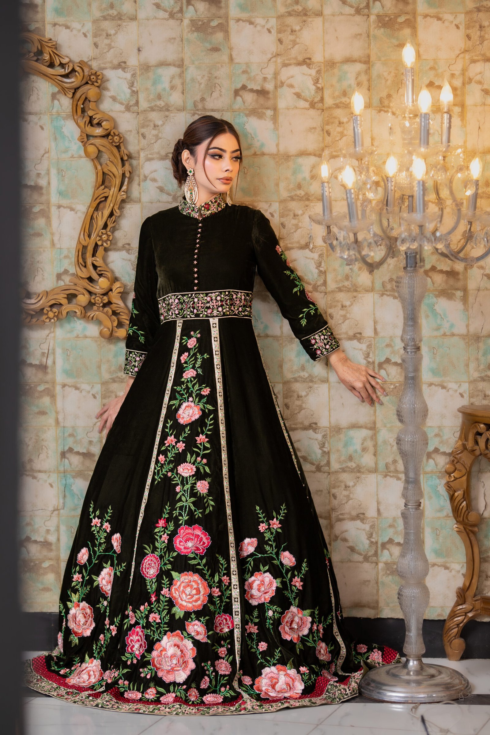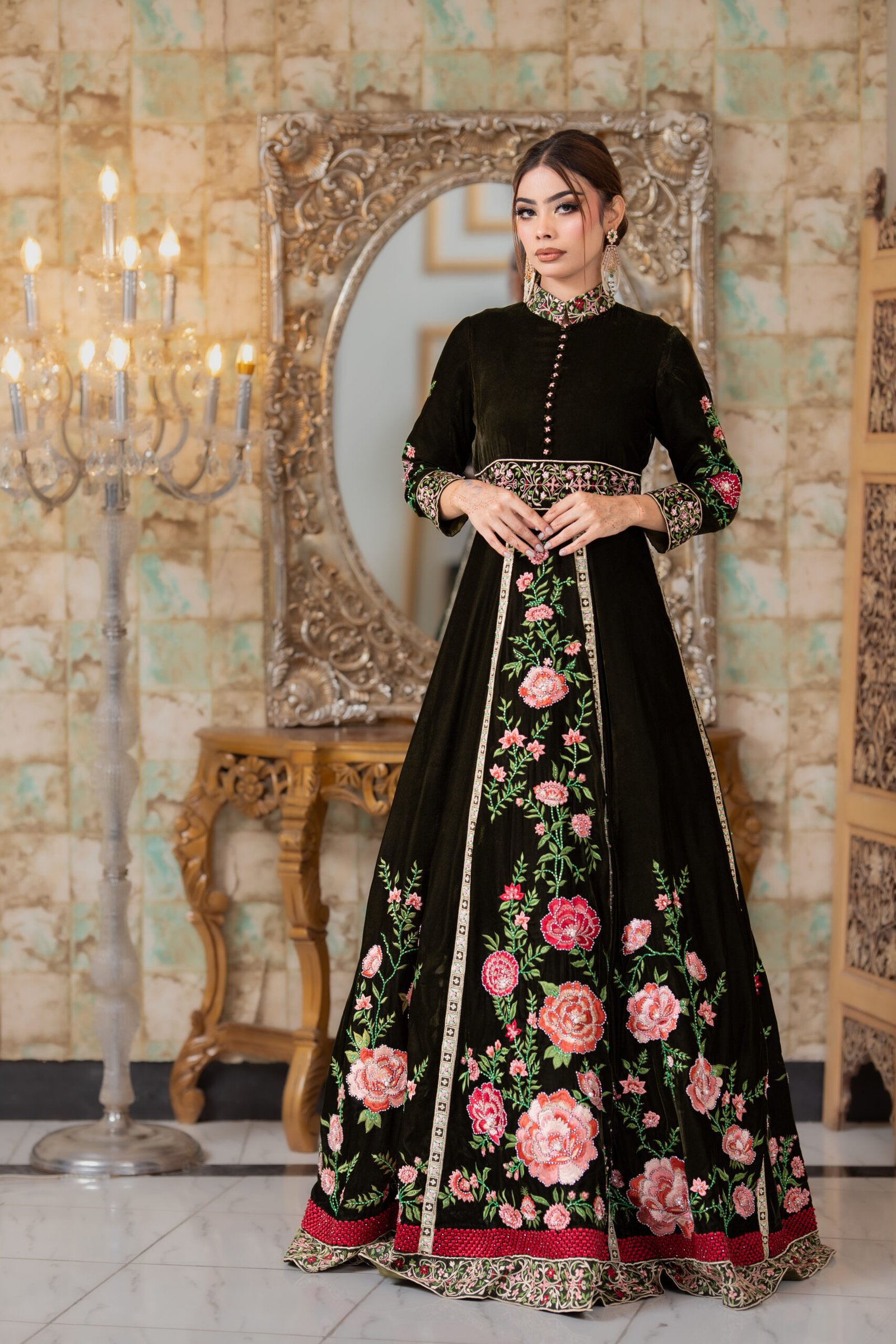 Deep olive green velvet one-piece with precision machine embroidery. Embellished with katdana, sequins, pearls, and crystals for refined luminance. Features an ornate neckline, detailed sleeves, and a gracefully structured silhouette. Ideal for formal receptions and high-end festive occasions.