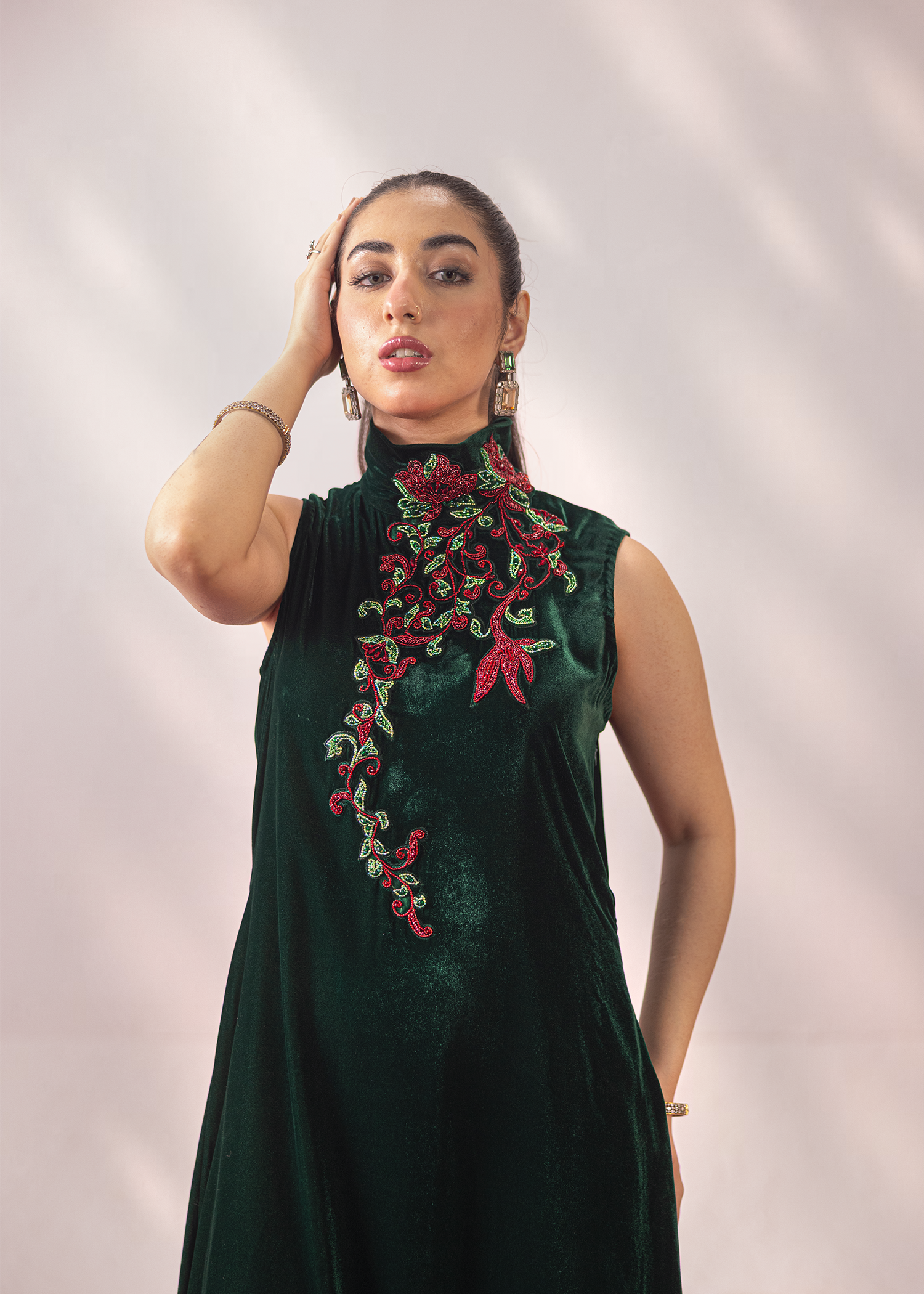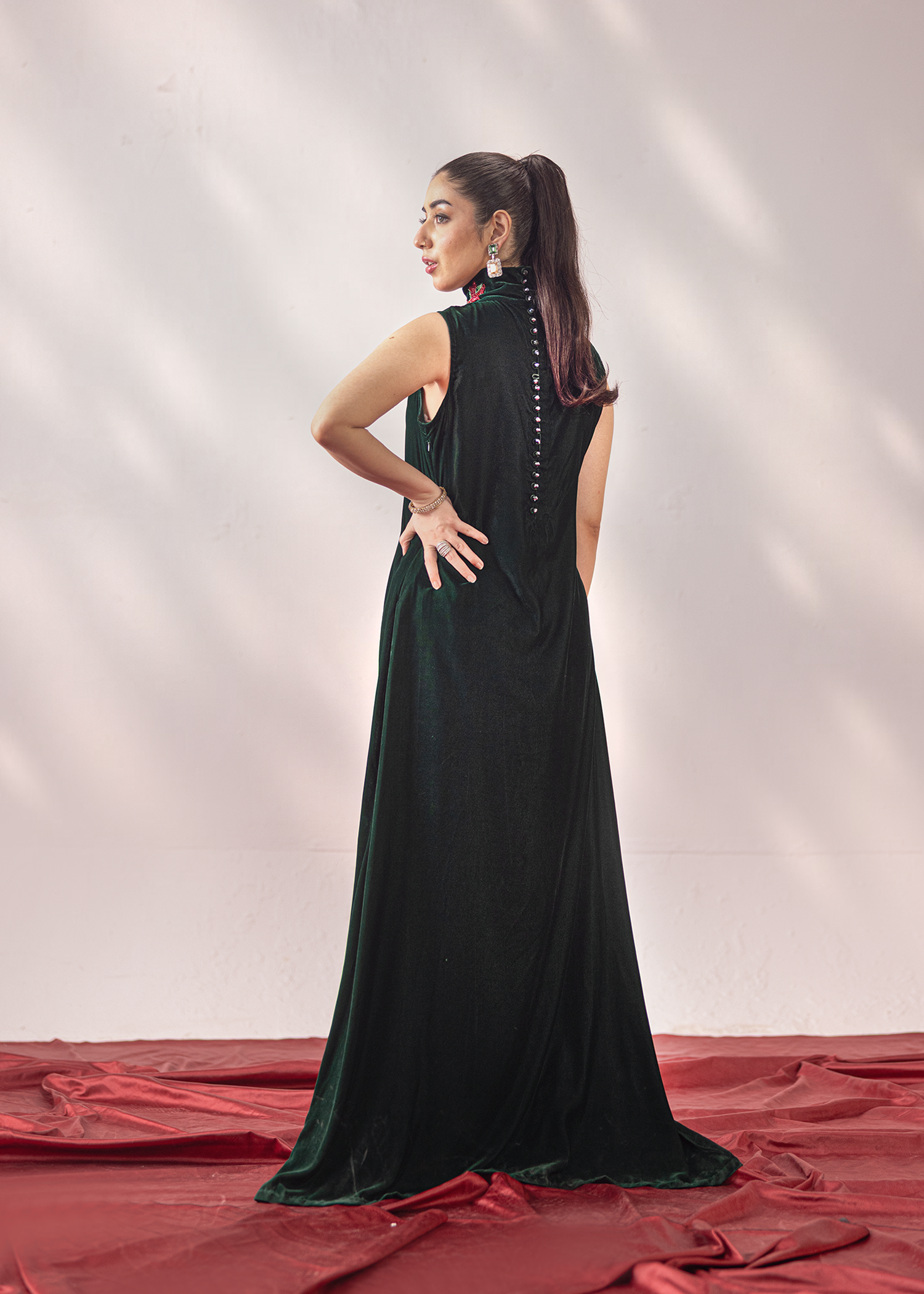 A one-piece gown in deep green velvet, tailored with a high neckline. Hand-embellished with katdana and crystals, the floral detailing adds a touch of refined elegance to the sleek silhouette.