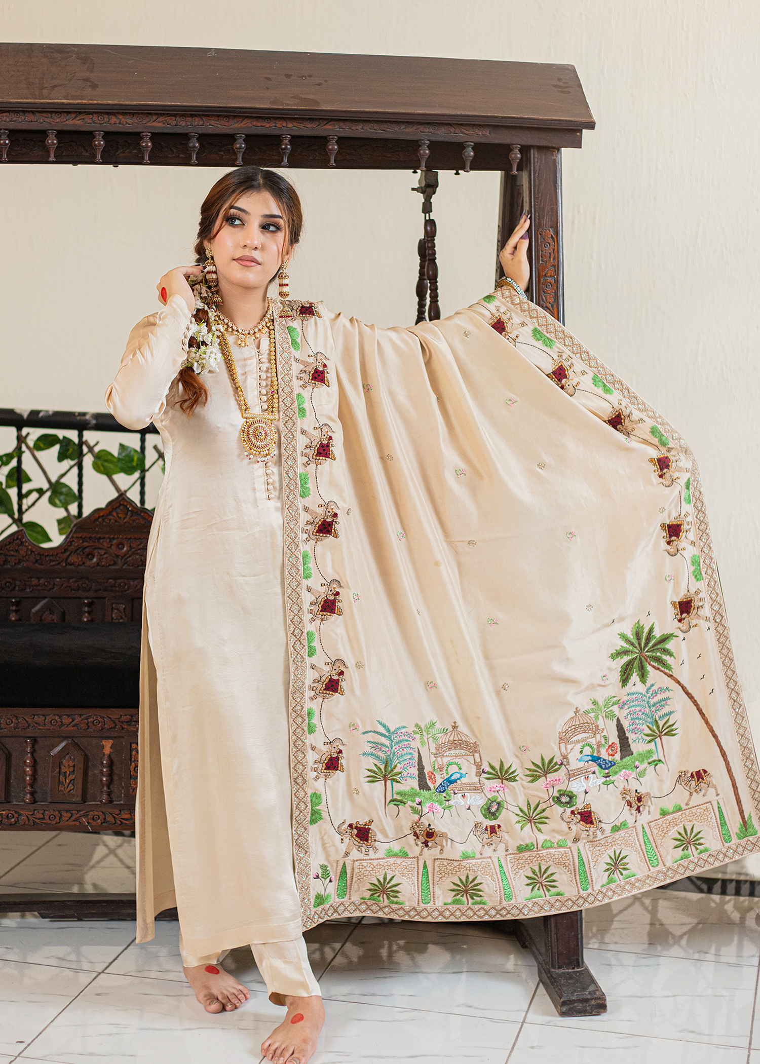 Three-piece ensemble in sand brown, crafted from rich silk and pure China silk. Adorned with intricate machine embroidery that captures artisanal finesse, the flowing silhouette offers timeless elegance with a contemporary edge. A versatile statement set, perfect for refined gatherings and cultural soirées.