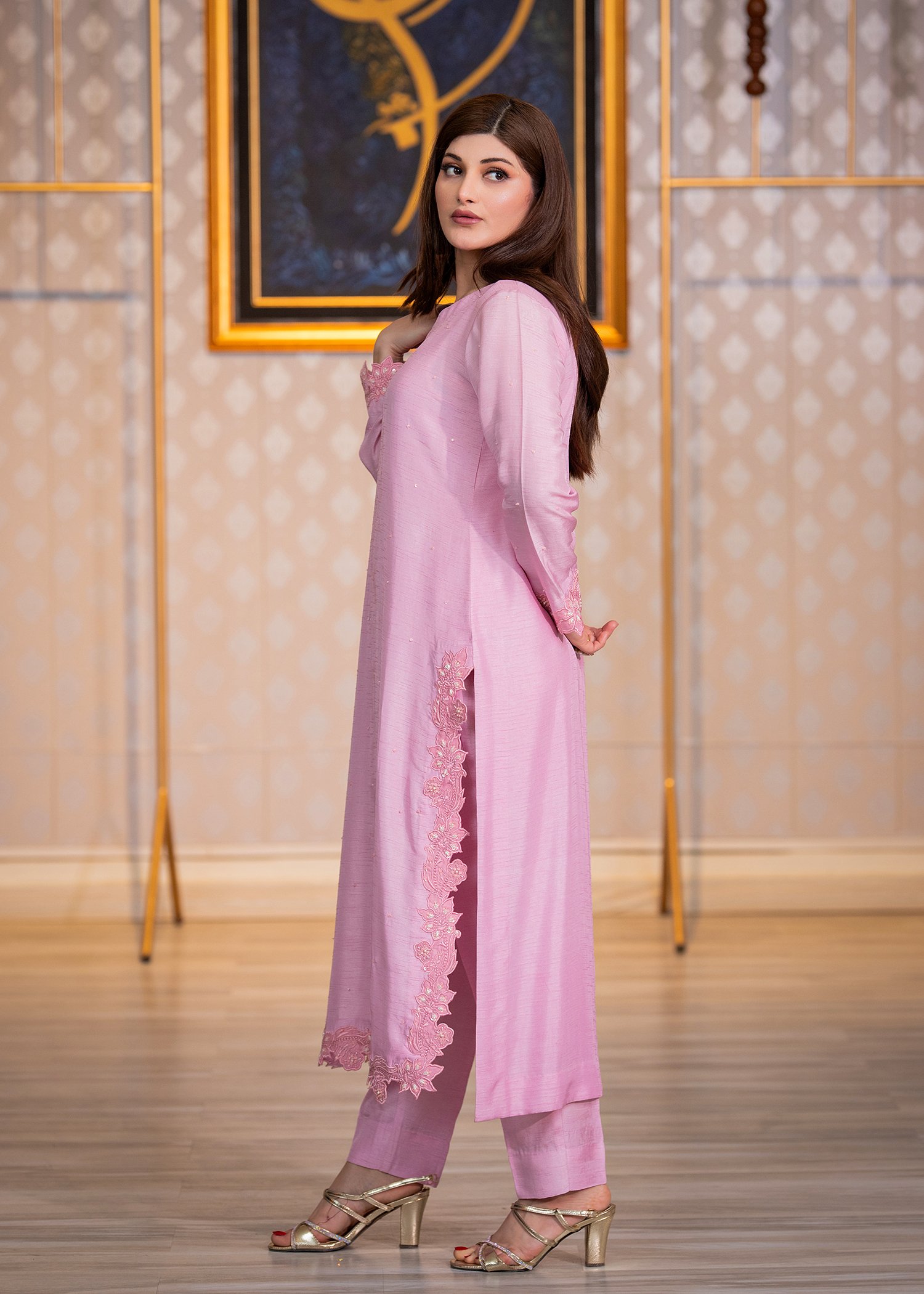 Rendered in a soft Lavender Pink, this ensemble is tailored from premium Korean silk for a smooth, structured fall. Fine machine embroidery enhances the surface with delicate texture, while hand embellishment with cutdana, sequins, and Swarovski crystals adds controlled brilliance along the borders and sleeves.